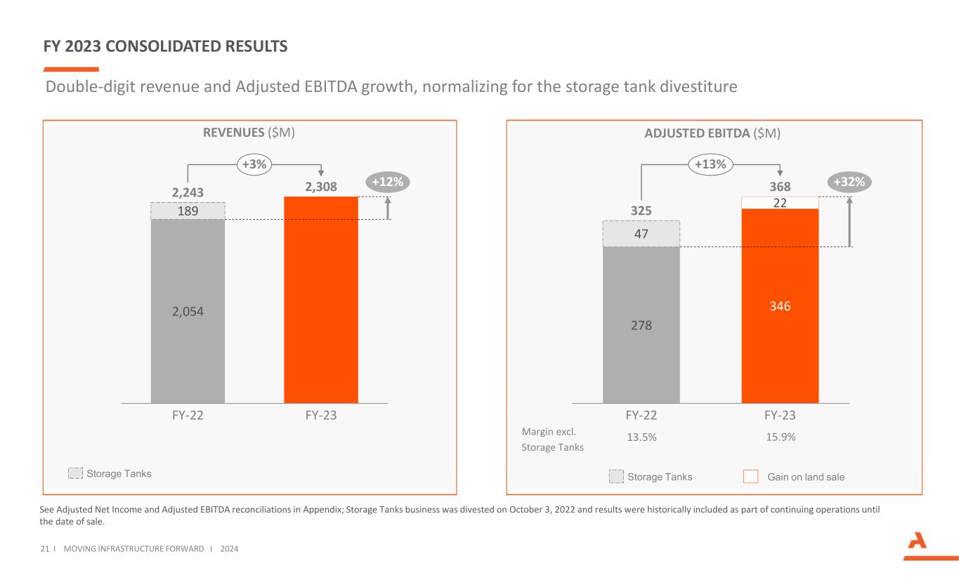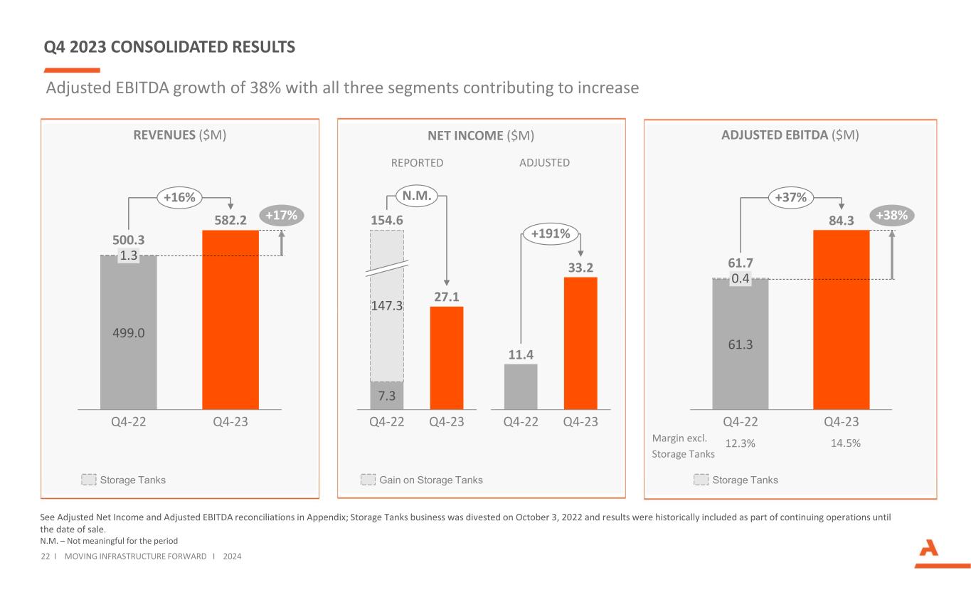FY 2023 CONSOLIDATED RESULTS See Adjusted Net Income and Adjusted EBITDA reconciliations in Appendix; Storage Tanks business was divested on October 3, 2022 and results were historically included as part of continuing operations until the date of sale. REVENUES ($M) ADJUSTED EBITDA ($M) 2,054 189 FY-22 FY-23 2,243 2,308 +12% +3% Double-digit revenue and Adjusted EBITDA growth, normalizing for the storage tank divestiture 21 I MOVING INFRASTRUCTURE FORWARD I 2024 278 346 47 22 FY-22 FY-23 325 368 +32% +13% Margin excl. Storage Tanks 13.5% 15.9% Storage Tanks Gain on land saleStorage Tanks