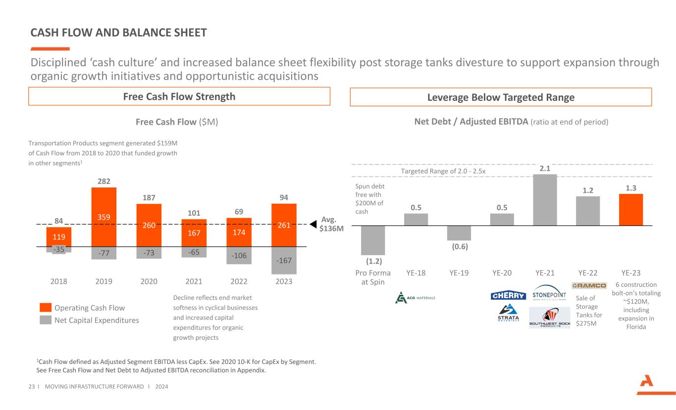 CASH FLOW AND BALANCE SHEET Disciplined ‘cash culture’ and increased balance sheet flexibility post storage tanks divesture to support expansion through organic growth initiatives and opportunistic acquisitions (1.2) 0.5 (0.6) 0.5 2.1 1.2 1.3 Pro Forma at Spin YE-18 YE-19 YE-20 YE-21 YE-22 YE-23 Net Debt / Adjusted EBITDA (ratio at end of period) 1Cash Flow defined as Adjusted Segment EBITDA less CapEx. See 2020 10-K for CapEx by Segment. See Free Cash Flow and Net Debt to Adjusted EBITDA reconciliation in Appendix. Targeted Range of 2.0 - 2.5x Transportation Products segment generated $159M of Cash Flow from 2018 to 2020 that funded growth in other segments1 Free Cash Flow Strength Free Cash Flow ($M) Leverage Below Targeted Range Spun debt free with $200M of cash 23 I MOVING INFRASTRUCTURE FORWARD I 2024 Sale of Storage Tanks for $275M 119 359 260 167 174 261 -77 -73 -65 -106 -167 -35 2018 2019 2020 2021 2022 2023 Avg. $136M 84 282 187 101 69 94 Operating Cash Flow Net Capital Expenditures Decline reflects end market softness in cyclical businesses and increased capital expenditures for organic growth projects 6 construction bolt-on’s totaling ~$120M, including expansion in Florida