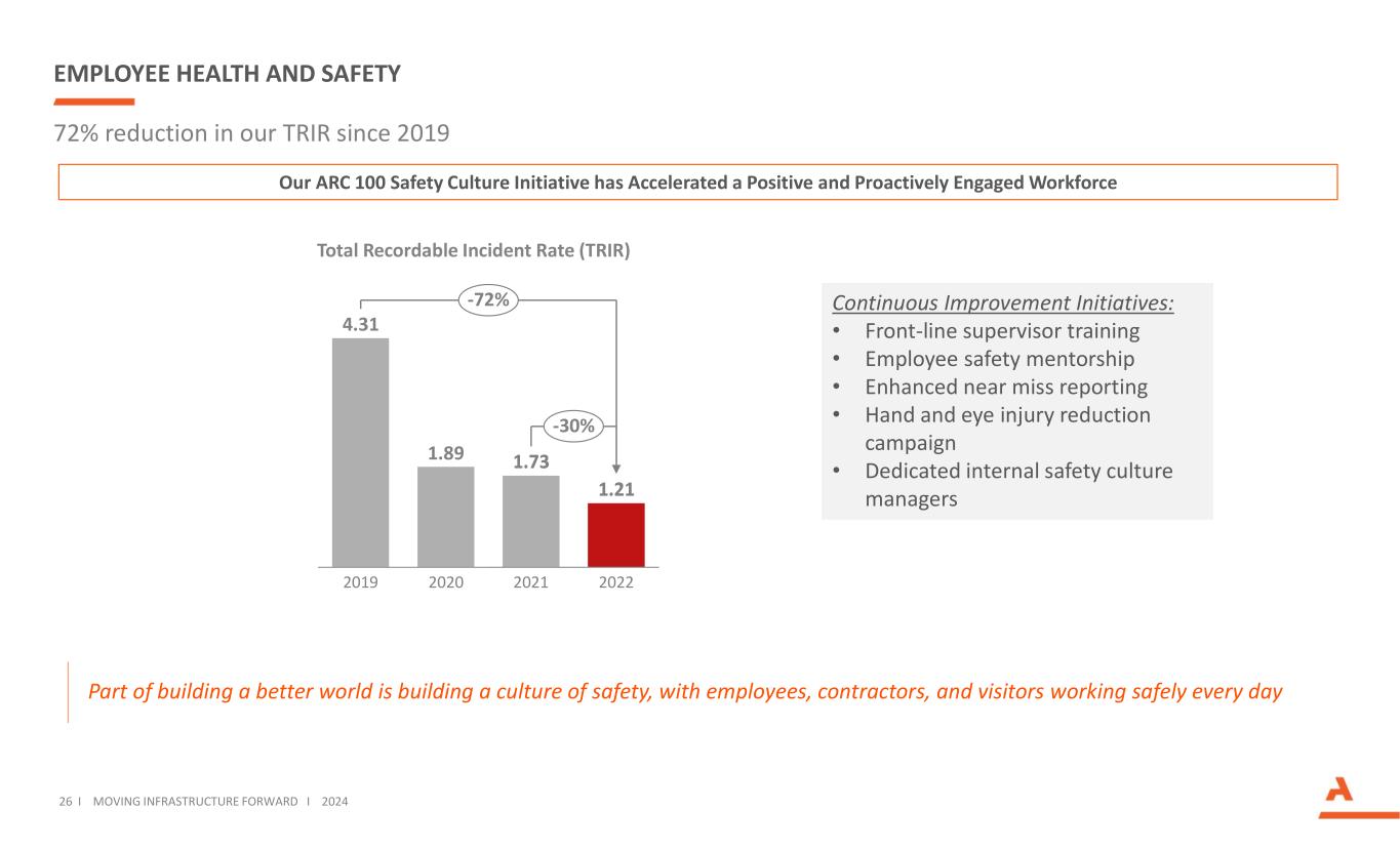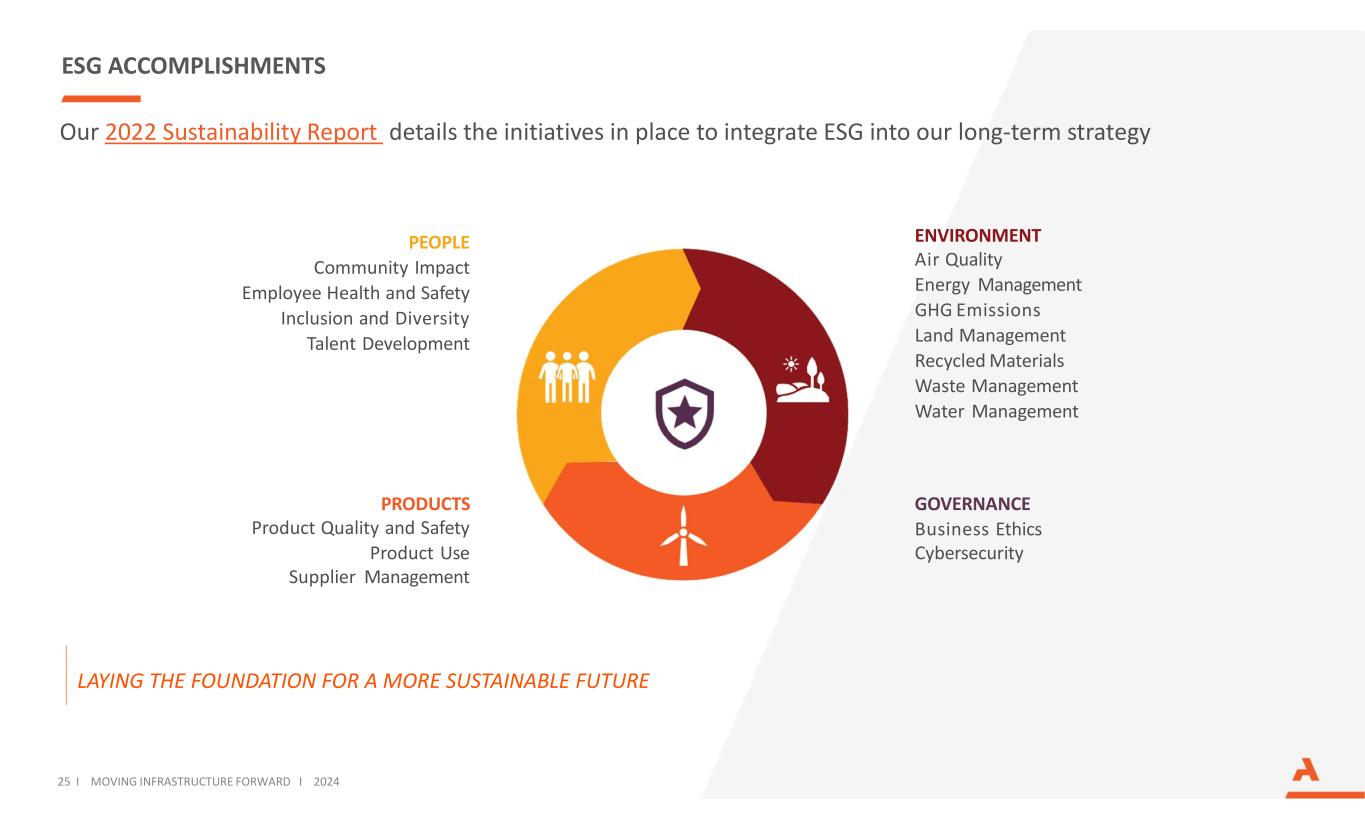 ESG ACCOMPLISHMENTS Our 2022 Sustainability Report details the initiatives in place to integrate ESG into our long-term strategy 25 I MOVING INFRASTRUCTURE FORWARD I 2024 PEOPLE Community Impact Employee Health and Safety Inclusion and Diversity Talent Development PRODUCTS Product Quality and Safety Product Use Supplier Management ENVIRONMENT Air Quality Energy Management GHG Emissions Land Management Recycled Materials Waste Management Water Management GOVERNANCE Business Ethics Cybersecurity LAYING THE FOUNDATION FOR A MORE SUSTAINABLE FUTURE