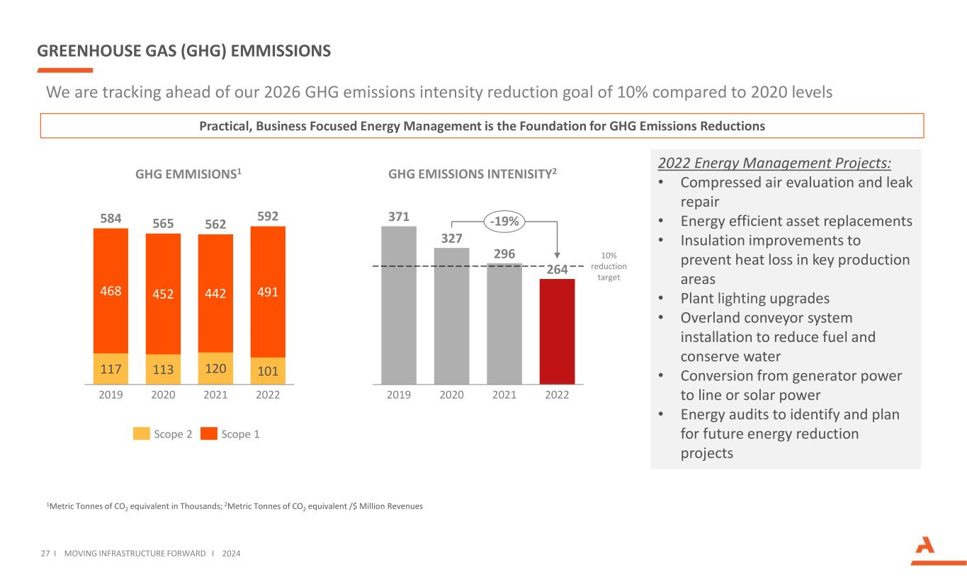 27 I MOVING INFRASTRUCTURE FORWARD I 2024 GREENHOUSE GAS (GHG) EMMISSIONS We are tracking ahead of our 2026 GHG emissions intensity reduction goal of 10% compared to 2020 levels 371 327 296 264 2020 20222019 2021 -19% GHG EMISSIONS INTENISITY2 117 113 120 101 468 452 442 491 2019 592 2020 2021 2022 584 565 562 Scope 2 Scope 1 GHG EMMISIONS1 10% reduction target 1Metric Tonnes of CO2 equivalent in Thousands; 2Metric Tonnes of CO2 equivalent /$ Million Revenues 2022 Energy Management Projects: • Compressed air evaluation and leak repair • Energy efficient asset replacements • Insulation improvements to prevent heat loss in key production areas • Plant lighting upgrades • Overland conveyor system installation to reduce fuel and conserve water • Conversion from generator power to line or solar power • Energy audits to identify and plan for future energy reduction projects Practical, Business Focused Energy Management is the Foundation for GHG Emissions Reductions