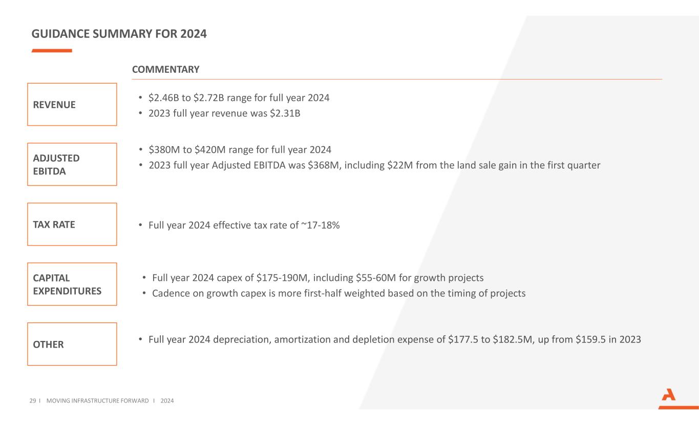 GUIDANCE SUMMARY FOR 2024 ADJUSTED EBITDA COMMENTARY CAPITAL EXPENDITURES OTHER • $380M to $420M range for full year 2024 • 2023 full year Adjusted EBITDA was $368M, including $22M from the land sale gain in the first quarter • Full year 2024 capex of $175-190M, including $55-60M for growth projects • Cadence on growth capex is more first-half weighted based on the timing of projects TAX RATE • Full year 2024 depreciation, amortization and depletion expense of $177.5 to $182.5M, up from $159.5 in 2023 • Full year 2024 effective tax rate of ~17-18% REVENUE • $2.46B to $2.72B range for full year 2024 • 2023 full year revenue was $2.31B 29 I MOVING INFRASTRUCTURE FORWARD I 2024