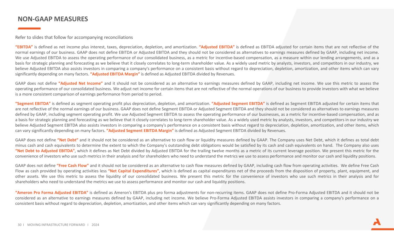 NON-GAAP MEASURES Refer to slides that follow for accompanying reconciliations “EBITDA” is defined as net income plus interest, taxes, depreciation, depletion, and amortization. “Adjusted EBITDA” is defined as EBITDA adjusted for certain items that are not reflective of the normal earnings of our business. GAAP does not define EBITDA or Adjusted EBITDA and they should not be considered as alternatives to earnings measures defined by GAAP, including net income. We use Adjusted EBITDA to assess the operating performance of our consolidated business, as a metric for incentive-based compensation, as a measure within our lending arrangements, and as a basis for strategic planning and forecasting as we believe that it closely correlates to long-term shareholder value. As a widely used metric by analysts, investors, and competitors in our industry, we believe Adjusted EBITDA also assists investors in comparing a company's performance on a consistent basis without regard to depreciation, depletion, amortization, and other items which can vary significantly depending on many factors. “Adjusted EBITDA Margin” is defined as Adjusted EBITDA divided by Revenues. GAAP does not define “Adjusted Net Income” and it should not be considered as an alternative to earnings measures defined by GAAP, including net income. We use this metric to assess the operating performance of our consolidated business. We adjust net income for certain items that are not reflective of the normal operations of our business to provide investors with what we believe is a more consistent comparison of earnings performance from period to period. “Segment EBITDA” is defined as segment operating profit plus depreciation, depletion, and amortization. “Adjusted Segment EBITDA” is defined as Segment EBITDA adjusted for certain items that are not reflective of the normal earnings of our business. GAAP does not define Segment EBITDA or Adjusted Segment EBITDA and they should not be considered as alternatives to earnings measures defined by GAAP, including segment operating profit. We use Adjusted Segment EBITDA to assess the operating performance of our businesses, as a metric for incentive-based compensation, and as a basis for strategic planning and forecasting as we believe that it closely correlates to long-term shareholder value. As a widely used metric by analysts, investors, and competitors in our industry we believe Adjusted Segment EBITDA also assists investors in comparing a company's performance on a consistent basis without regard to depreciation, depletion, amortization, and other items, which can vary significantly depending on many factors. “Adjusted Segment EBITDA Margin” is defined as Adjusted Segment EBITDA divided by Revenues. GAAP does not define “Net Debt” and it should not be considered as an alternative to cash flow or liquidity measures defined by GAAP. The Company uses Net Debt, which it defines as total debt minus cash and cash equivalents to determine the extent to which the Company’s outstanding debt obligations would be satisfied by its cash and cash equivalents on hand. The Company also uses “Net Debt to Adjusted EBITDA”, which it defines as Net Debt divided by Adjusted EBITDA for the trailing twelve months as a metric of its current leverage position. We present this metric for the convenience of investors who use such metrics in their analysis and for shareholders who need to understand the metrics we use to assess performance and monitor our cash and liquidity positions. GAAP does not define “Free Cash Flow” and it should not be considered as an alternative to cash flow measures defined by GAAP, including cash flow from operating activities. We define Free Cash Flow as cash provided by operating activities less “Net Capital Expenditures”, which is defined as capital expenditures net of the proceeds from the disposition of property, plant, equipment, and other assets. We use this metric to assess the liquidity of our consolidated business. We present this metric for the convenience of investors who use such metrics in their analysis and for shareholders who need to understand the metrics we use to assess performance and monitor our cash and liquidity positions. “Ameron Pro Forma Adjusted EBITDA” is defined as Ameron's EBITDA plus pro forma adjustments for non-recurring items. GAAP does not define Pro-Forma Adjusted EBITDA and it should not be considered as an alternative to earnings measures defined by GAAP, including net income. We believe Pro-Forma Adjusted EBITDA assists investors in comparing a company's performance on a consistent basis without regard to depreciation, depletion, amortization, and other items which can vary significantly depending on many factors. 30 I MOVING INFRASTRUCTURE FORWARD I 2024