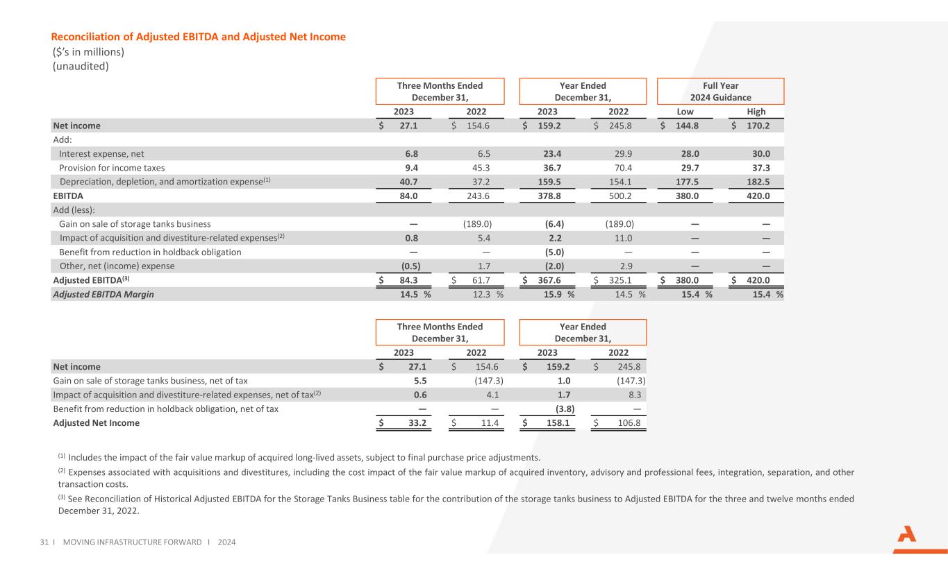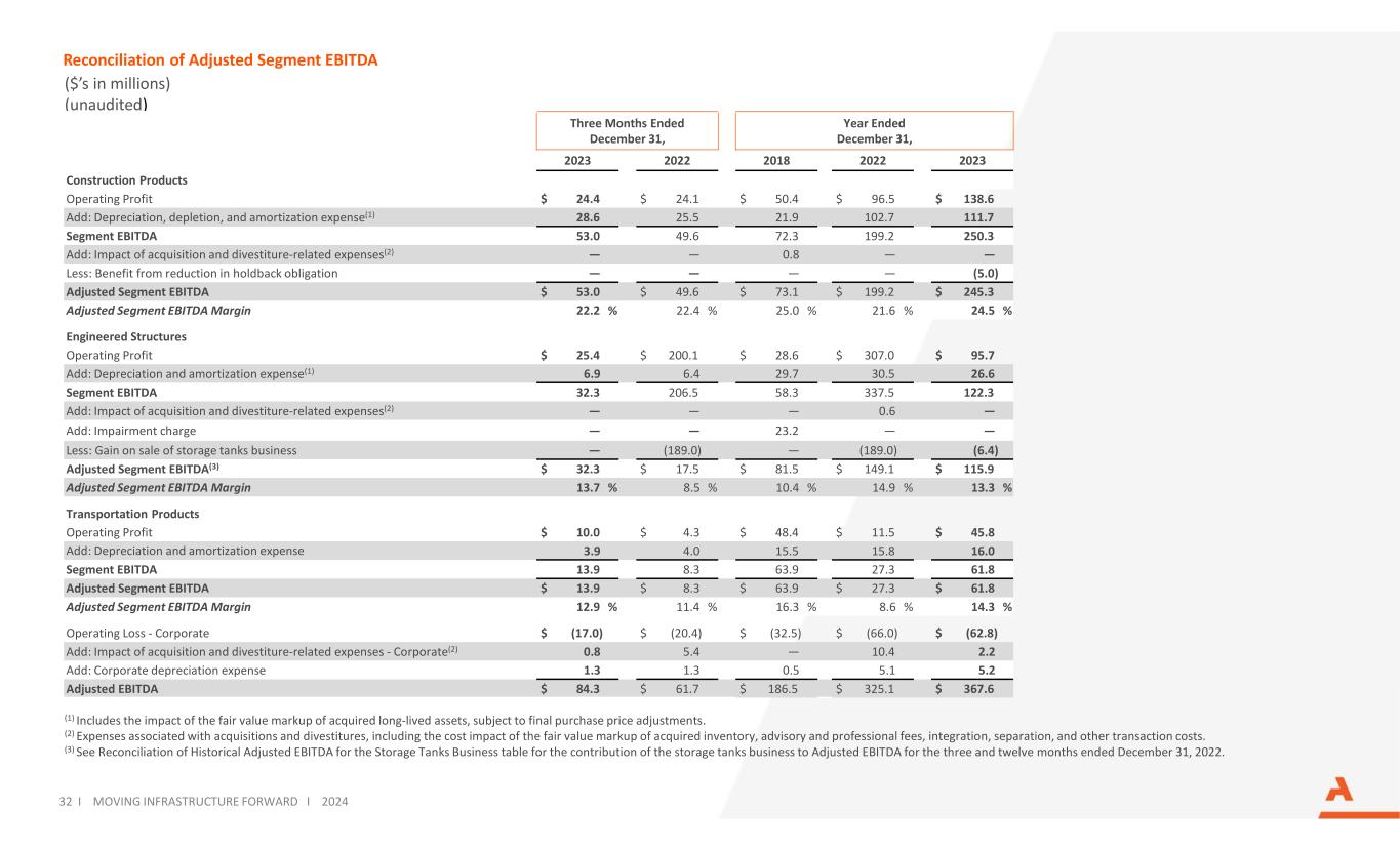 Reconciliation of Adjusted EBITDA and Adjusted Net Income ($’s in millions) (unaudited) 31 I MOVING INFRASTRUCTURE FORWARD I 2024 Three Months Ended December 31, Year Ended December 31, Full Year 2024 Guidance 2023 2022 2023 2022 Low High Net income $ 27.1 $ 154.6 $ 159.2 $ 245.8 $ 144.8 $ 170.2 Add: Interest expense, net 6.8 6.5 23.4 29.9 28.0 30.0 Provision for income taxes 9.4 45.3 36.7 70.4 29.7 37.3 Depreciation, depletion, and amortization expense(1) 40.7 37.2 159.5 154.1 177.5 182.5 EBITDA 84.0 243.6 378.8 500.2 380.0 420.0 Add (less): Gain on sale of storage tanks business — (189.0) (6.4) (189.0) — — Impact of acquisition and divestiture-related expenses(2) 0.8 5.4 2.2 11.0 — — Benefit from reduction in holdback obligation — — (5.0) — — — Other, net (income) expense (0.5) 1.7 (2.0) 2.9 — — Adjusted EBITDA(3) $ 84.3 $ 61.7 $ 367.6 $ 325.1 $ 380.0 $ 420.0 Adjusted EBITDA Margin 14.5 % 12.3 % 15.9 % 14.5 % 15.4 % 15.4 % Three Months Ended December 31, Year Ended December 31, 2023 2022 2023 2022 Net income $ 27.1 $ 154.6 $ 159.2 $ 245.8 Gain on sale of storage tanks business, net of tax 5.5 (147.3) 1.0 (147.3) Impact of acquisition and divestiture-related expenses, net of tax(2) 0.6 4.1 1.7 8.3 Benefit from reduction in holdback obligation, net of tax — — (3.8) — Adjusted Net Income $ 33.2 $ 11.4 $ 158.1 $ 106.8 (1) Includes the impact of the fair value markup of acquired long-lived assets, subject to final purchase price adjustments. (2) Expenses associated with acquisitions and divestitures, including the cost impact of the fair value markup of acquired inventory, advisory and professional fees, integration, separation, and other transaction costs. (3) See Reconciliation of Historical Adjusted EBITDA for the Storage Tanks Business table for the contribution of the storage tanks business to Adjusted EBITDA for the three and twelve months ended December 31, 2022.