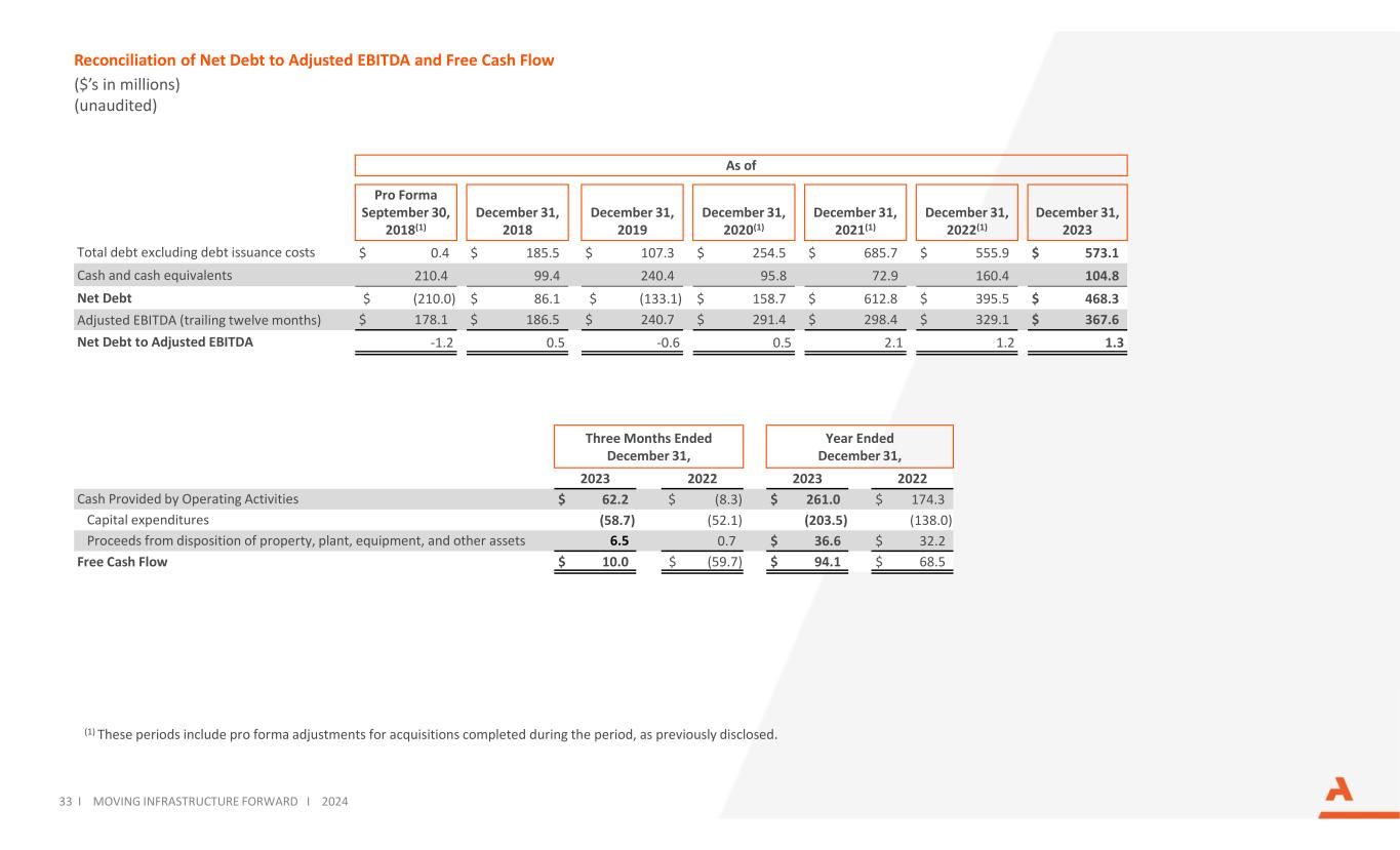 Reconciliation of Net Debt to Adjusted EBITDA and Free Cash Flow ($’s in millions) (unaudited) 33 I MOVING INFRASTRUCTURE FORWARD I 2024 (1) These periods include pro forma adjustments for acquisitions completed during the period, as previously disclosed. As of Pro Forma September 30, 2018(1) December 31, 2018 December 31, 2019 December 31, 2020(1) December 31, 2021(1) December 31, 2022(1) December 31, 2023 Total debt excluding debt issuance costs $ 0.4 $ 185.5 $ 107.3 $ 254.5 $ 685.7 $ 555.9 $ 573.1 Cash and cash equivalents 210.4 99.4 240.4 95.8 72.9 160.4 104.8 Net Debt $ (210.0) $ 86.1 $ (133.1) $ 158.7 $ 612.8 $ 395.5 $ 468.3 Adjusted EBITDA (trailing twelve months) $ 178.1 $ 186.5 $ 240.7 $ 291.4 $ 298.4 $ 329.1 $ 367.6 Net Debt to Adjusted EBITDA -1.2 0.5 -0.6 0.5 2.1 1.2 1.3 Three Months Ended December 31, Year Ended December 31, 2023 2022 2023 2022 Cash Provided by Operating Activities $ 62.2 $ (8.3) $ 261.0 $ 174.3 Capital expenditures (58.7) (52.1) (203.5) (138.0) Proceeds from disposition of property, plant, equipment, and other assets 6.5 0.7 $ 36.6 $ 32.2 Free Cash Flow $ 10.0 $ (59.7) $ 94.1 $ 68.5