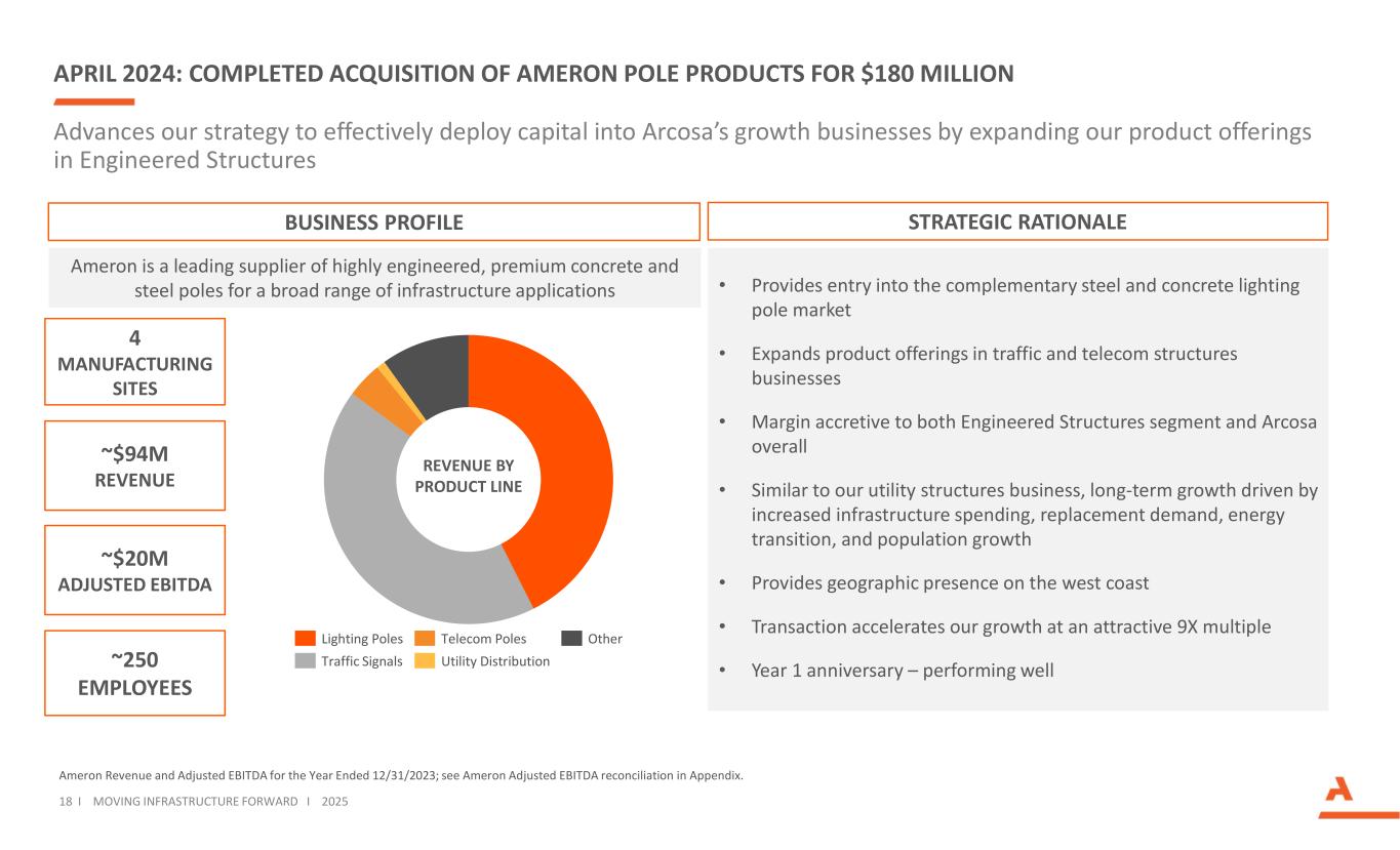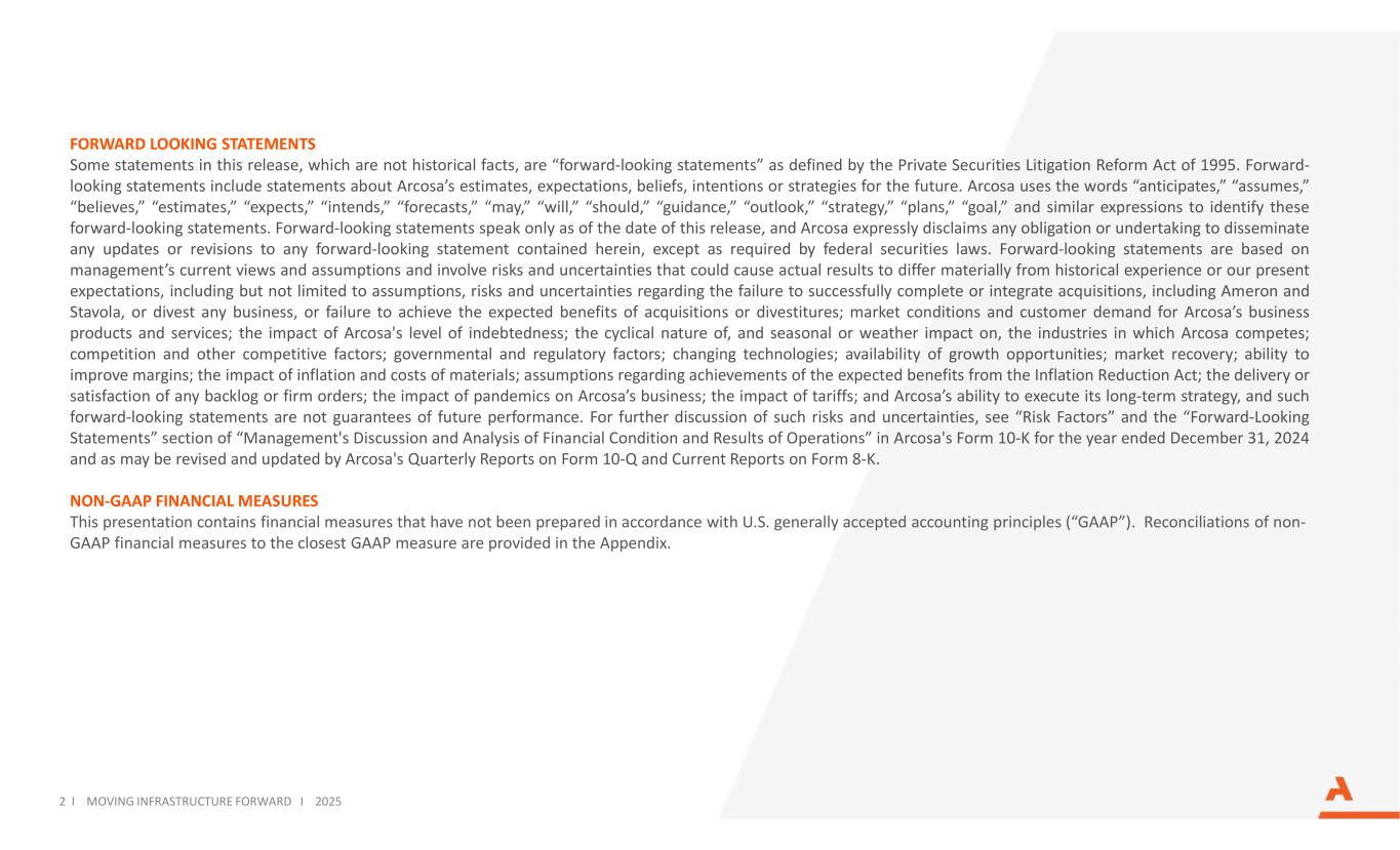 2 I MOVING INFRASTRUCTURE FORWARD I 2025 FORWARD LOOKING STATEMENTS Some statements in this release, which are not historical facts, are “forward-looking statements” as defined by the Private Securities Litigation Reform Act of 1995. Forward- looking statements include statements about Arcosa’s estimates, expectations, beliefs, intentions or strategies for the future. Arcosa uses the words “anticipates,” “assumes,” “believes,” “estimates,” “expects,” “intends,” “forecasts,” “may,” “will,” “should,” “guidance,” “outlook,” “strategy,” “plans,” “goal,” and similar expressions to identify these forward-looking statements. Forward-looking statements speak only as of the date of this release, and Arcosa expressly disclaims any obligation or undertaking to disseminate any updates or revisions to any forward-looking statement contained herein, except as required by federal securities laws. Forward-looking statements are based on management’s current views and assumptions and involve risks and uncertainties that could cause actual results to differ materially from historical experience or our present expectations, including but not limited to assumptions, risks and uncertainties regarding the failure to successfully complete or integrate acquisitions, including Ameron and Stavola, or divest any business, or failure to achieve the expected benefits of acquisitions or divestitures; market conditions and customer demand for Arcosa’s business products and services; the impact of Arcosa's level of indebtedness; the cyclical nature of, and seasonal or weather impact on, the industries in which Arcosa competes; competition and other competitive factors; governmental and regulatory factors; changing technologies; availability of growth opportunities; market recovery; ability to improve margins; the impact of inflation and costs of materials; assumptions regarding achievements of the expected benefits from the Inflation Reduction Act; the delivery or satisfaction of any backlog or firm orders; the impact of pandemics on Arcosa’s business; the impact of tariffs; and Arcosa’s ability to execute its long-term strategy, and such forward-looking statements are not guarantees of future performance. For further discussion of such risks and uncertainties, see “Risk Factors” and the “Forward-Looking Statements” section of “Management's Discussion and Analysis of Financial Condition and Results of Operations” in Arcosa's Form 10-K for the year ended December 31, 2024 and as may be revised and updated by Arcosa's Quarterly Reports on Form 10-Q and Current Reports on Form 8-K. NON-GAAP FINANCIAL MEASURES This presentation contains financial measures that have not been prepared in accordance with U.S. generally accepted accounting principles (“GAAP”). Reconciliations of non- GAAP financial measures to the closest GAAP measure are provided in the Appendix.
