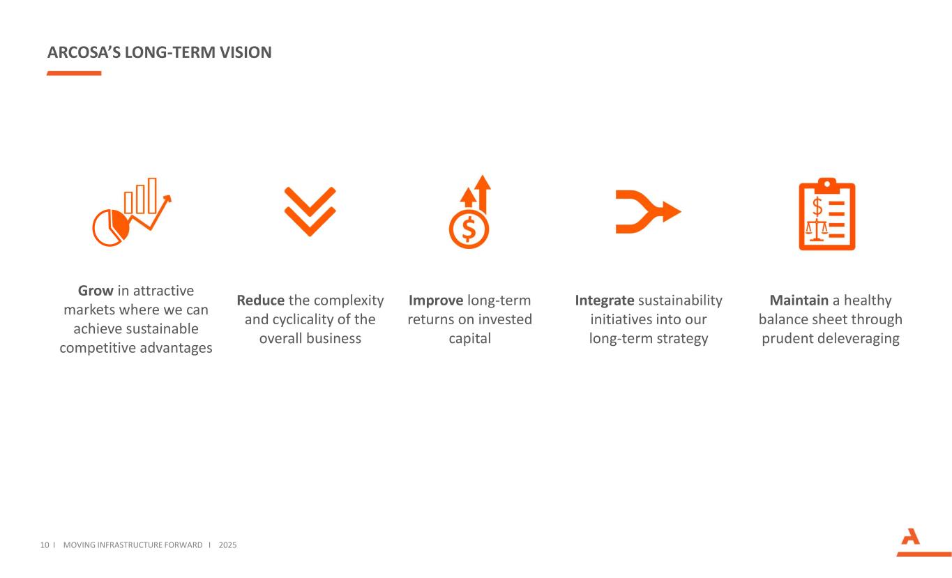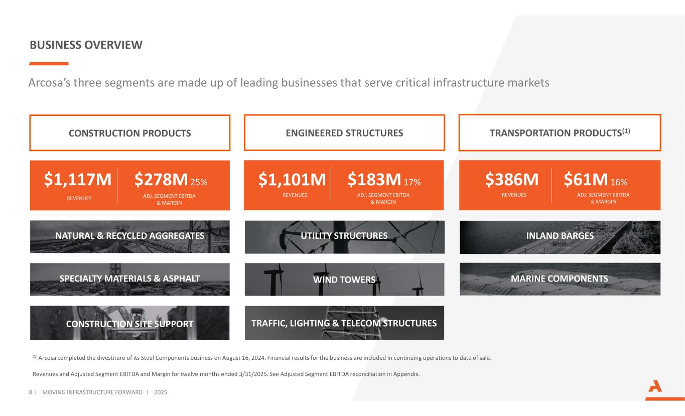 ARCOSA AT A GLANCE Revenues, Adjusted Net Income, and Adjusted EBITDA are for the twelve months ended 03/31/2025. See Adjusted Net Income and Adjusted EBITDA reconciliations in Appendix. Headcount is as of 12/31/2024. Arcosa completed the divestiture of its Steel Components business on August 16, 2024. Financial results for the business are included in continuing operations to date of sale. Adjusted Net Income Adjusted EBITDA Infrastructure-related Segments Employees Years of Operating History OUR THREE BUSINESS SEGMENTS Revenues$2.6B $136M $465M ~6,250 85+ 3 7 I MOVING INFRASTRUCTURE FORWARD I 2025