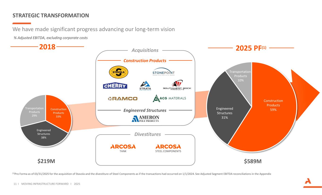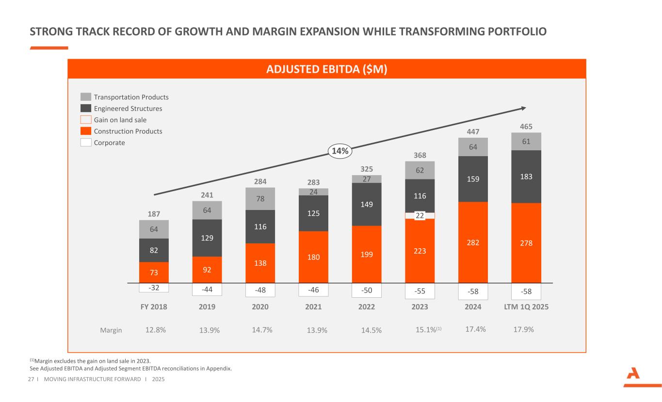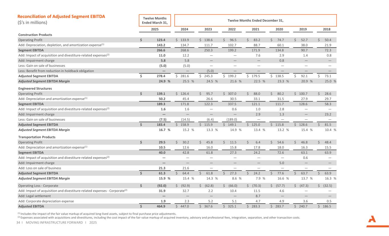 34 Moving Infrastructure ForwardI MOVING INFRASTRUCTURE FORWARD I 2025 Reconciliation of Adjusted Segment EBITDA (1) Includes the impact of the fair value markup of acquired long-lived assets, subject to final purchase price adjustments. (2) Expenses associated with acquisitions and divestitures, including the cost impact of the fair value markup of acquired inventory, advisory and professional fees, integration, separation, and other transaction costs. ($’s in millions) (unaudited) Twelve Months Ended December 31,Twelve Months Ended March 31, 20182019202020212022202320242025 Construction Products $ 50.4$ 52.7$ 74.7$ 83.2$ 96.5$ 138.6$ 133.9$ 123.4Operating Profit 21.938.060.188.7102.7111.7134.7143.2Add: Depreciation, depletion, and amortization expense(1) 72.390.7134.8171.9199.2250.3268.6266.6Segment EBITDA 0.81.42.97.6——12.211.0Add: Impact of acquisition and divestiture-related expenses(2) ——0.8———5.85.8Add: Impairment charge ——————(5.0)(5.0)Less: Gain on sale of businesses —————(5.0)——Less: Benefit from reduction in holdback obligation $ 73.1$ 92.1$ 138.5$ 179.5$ 199.2$ 245.3$ 281.6$ 278.4Adjusted Segment EBITDA 25.0 %20.9 %23.3 %22.5 %21.6 %24.5 %25.5 %24.9 %Adjusted Segment EBITDA Margin Engineered Structures $ 28.6$ 100.7$ 80.2$ 88.0$ 307.0$ 95.7$ 126.4$ 139.1Operating Profit 29.727.931.533.130.526.645.450.2Add: Depreciation and amortization expense(1) 58.3128.6111.7121.1337.5122.3171.8189.3Segment EBITDA ——2.81.00.6—1.61.6Add: Impact of acquisition and divestiture-related expenses(2) 23.2—1.32.9————Add: Impairment charge ————(189.0)(6.4)(14.5)(7.5)Less: Gain on sale of businesses $ 81.5$ 128.6$ 115.8$ 125.0$ 149.1$ 115.9$ 158.9$ 183.4Adjusted Segment EBITDA 10.4 %15.4 %13.2 %13.4 %14.9 %13.3 %15.2 %16.7 %Adjusted Segment EBITDA Margin Transportation Products $ 48.4$ 46.8$ 54.6$ 6.4$ 11.5$ 45.8$ 30.2$ 29.5Operating Profit 15.516.318.017.815.816.012.610.5Add: Depreciation and amortization expense(1) 63.963.172.624.227.361.842.840.0Segment EBITDA —0.6——————Add: Impact of acquisition and divestiture-related expenses(2) ——5.0—————Add: Impairment charge ——————21.621.3Add: Loss on sale of business $ 63.9$ 63.7$ 77.6$ 24.2$ 27.3$ 61.8$ 64.4$ 61.3Adjusted Segment EBITDA 16.3 %13.7 %16.6 %7.9 %8.6 %14.3 %15.4 %15.9 %Adjusted Segment EBITDA Margin $ (32.5)$ (47.3)$ (57.7)$ (70.3)$ (66.0)$ (62.8)$ (92.9)$ (92.0)Operating Loss - Corporate ——4.611.510.42.232.731.9Add: Impact of acquisition and divestiture-related expenses - Corporate(2) ———8.7————Add: Legal settlement 0.53.64.94.75.15.22.31.9Add: Corporate depreciation expense $ 186.5$ 240.7$ 283.7$ 283.3$ 325.1$ 367.6$ 447.0$ 464.9Adjusted EBITDA