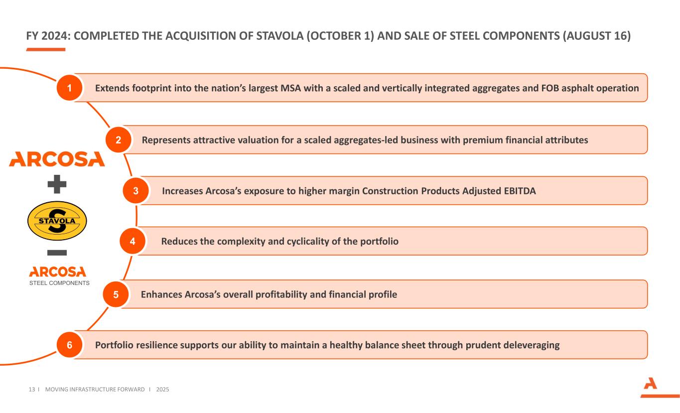 ~$2.7 billion of investment in Construction Products acquisitions as we seek to expand our growth platforms 12 I MOVING INFRASTRUCTURE FORWARD I 2025 ONGOING INVESTMENT IN OUR CONSTRUCTION PRODUCTS PLATFORM Q4 2024Q2 2022Q3 2021Q2 2021Q3 2020Q1 2020Q4 2018KEY ACQUISITIONS Natural Aggregates Recycled Aggregates FOB Asphalt Recycled AggregatesNatural AggregatesNatural AggregatesRecycled Aggregates Natural Aggregates Recycled Aggregates Natural Aggregates Specialty Materials Natural AggregatesPRODUCT LINE  Expand exposure to northeast region  Adding scaled and vertically aggregates and asphalt operations  Entry into Southern California market  Scaled entry into Phoenix  Entry into attractive new geographies (TN, KY, and PA)  Expanded presence in TX and along the Gulf  Expanded presence in DFW  Increased exposure to recycled aggregates  Expanded presence in Houston  Entry into recycled aggregates  Added complementary scaled platform  Diversified customer based and end-markets STRATEGIC FIT 5 active mines 3 recycled aggregates facilities 12 asphalt plants 4 crushing locations6 active mines14 active mines 5 crushing locations 1 active mines 12 locations 24 active mines 5 production facilitesLOCATION COUNT $1,200M$75M$150M$375M$87M$298M$315MPURCHASE PRICE 10.7X(1)7.8X10.7X12.9X(1)8.5X8.1X9.8XPURCHASE MULTIPLE Attractive fundamentals of Aggregates and Specialty Materials ● Attractive markets with long-term pricing and volume growth; less cyclical than other Arcosa businesses ● Sustainable competitive advantages, through reserve positions, permits, product portfolio, proprietary processing capabilities, and deep market knowledge ● Fragmented industry structure with ability to buy small to medium size assets at attractive multiples ● Ability to use acquisitions as growth platforms for future organic and bolt-on opportunities (1) Multiple shown net of estimated tax benefits