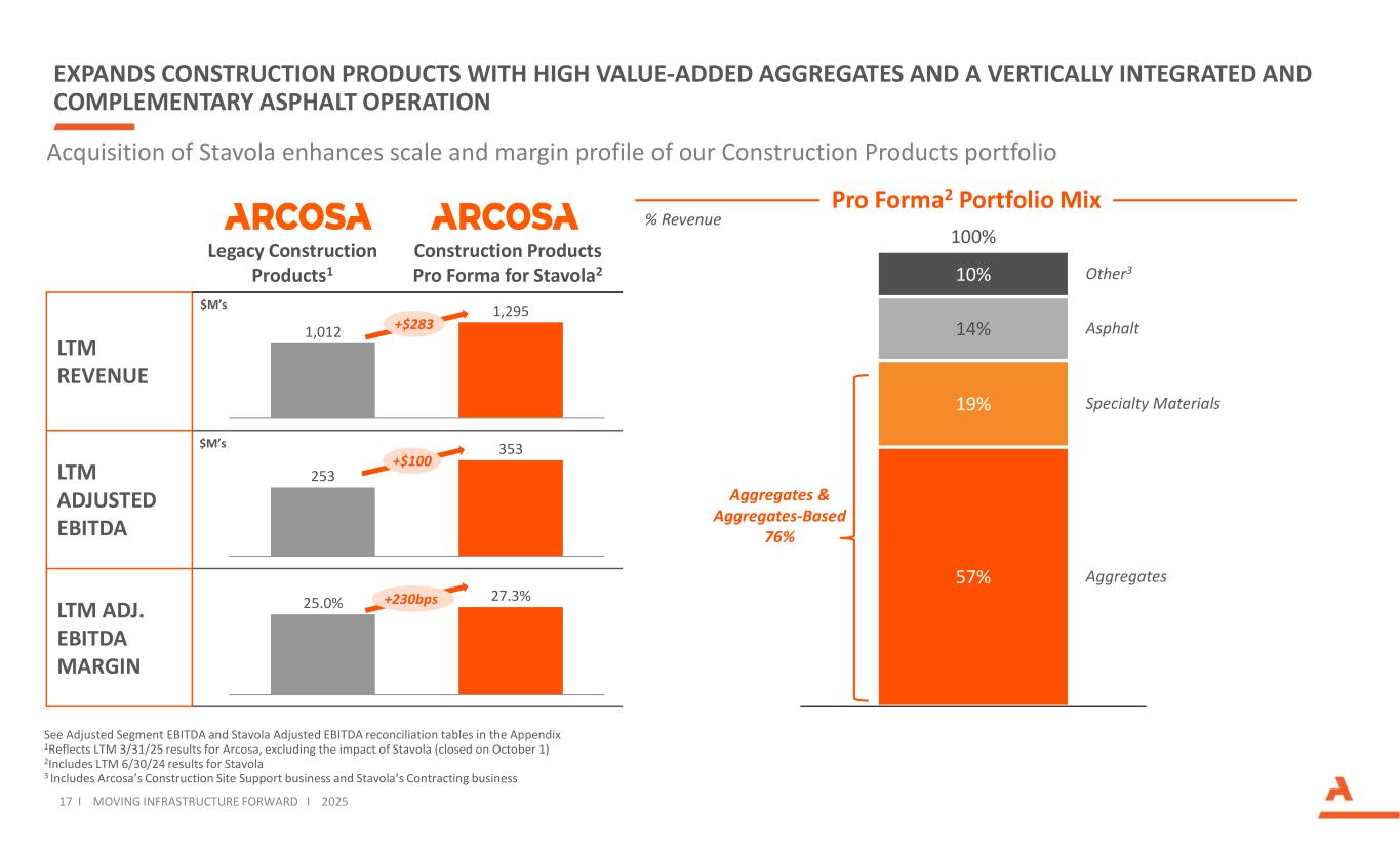 STAVOLA EXTENDS ARCOSA’S FOOTPRINT INTO THE NATION’S LARGEST MSA 16 I MOVING INFRASTRUCTURE FORWARD I 2025 Infrastructure 75–85% Residential 10–20% Non-residential 5–15% Aggregates Demand Asphalt Demand Infrastructure 80–90% Residential 5–10% Non-residential 5–10% Stavola’s Core Markets Are Over-Indexed to Infrastructure Demand 29M Tons ~80 – 90% of asphalt demand in Stavola’s core market is from maintenance projects, providing stability and low volatility 9M Tons Source: Third party research, USGS