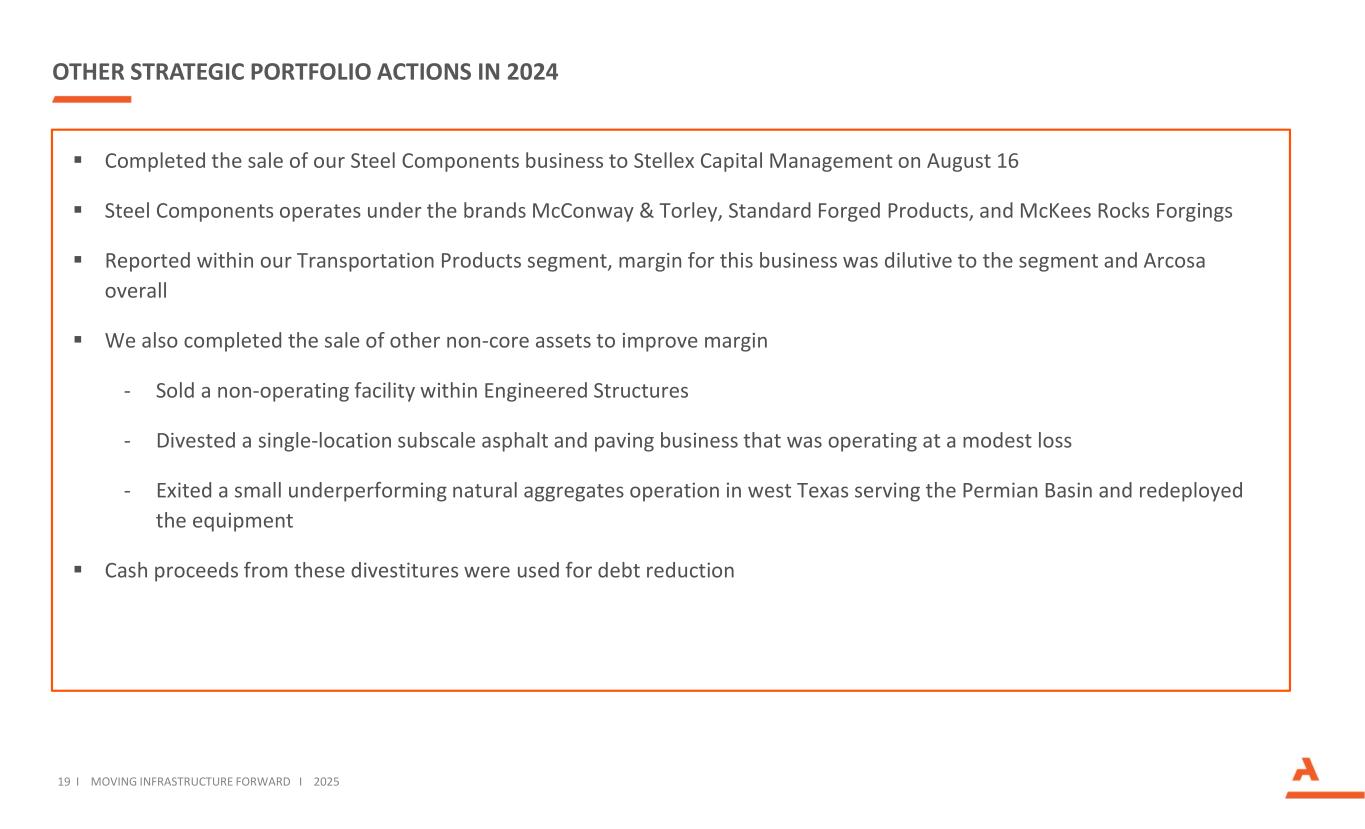 OTHER STRATEGIC PORTFOLIO ACTIONS IN 2024 19 I MOVING INFRASTRUCTURE FORWARD I 2025  Completed the sale of our Steel Components business to Stellex Capital Management on August 16  Steel Components operates under the brands McConway & Torley, Standard Forged Products, and McKees Rocks Forgings  Reported within our Transportation Products segment, margin for this business was dilutive to the segment and Arcosa overall  We also completed the sale of other non-core assets to improve margin - Sold a non-operating facility within Engineered Structures - Divested a single-location subscale asphalt and paving business that was operating at a modest loss - Exited a small underperforming natural aggregates operation in west Texas serving the Permian Basin and redeployed the equipment  Cash proceeds from these divestitures were used for debt reduction