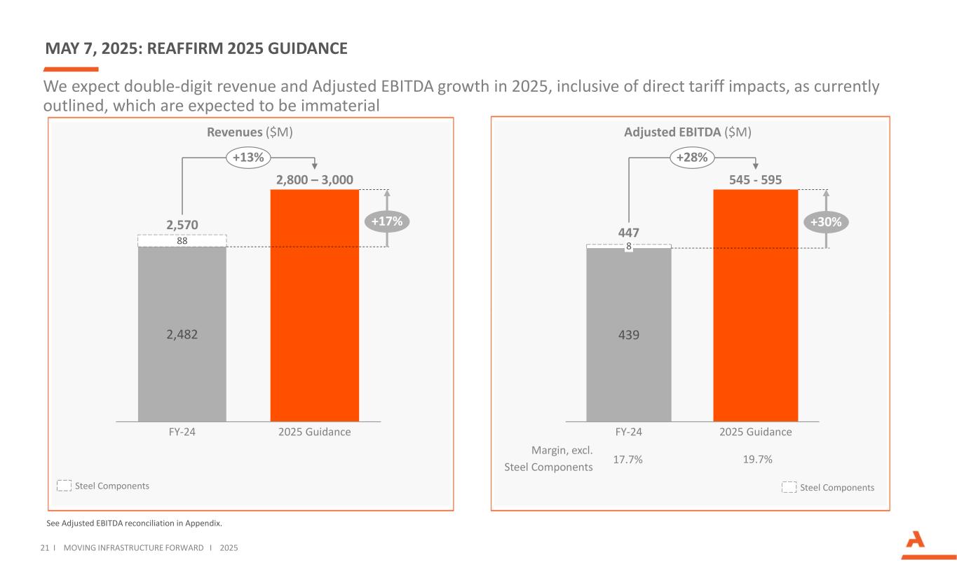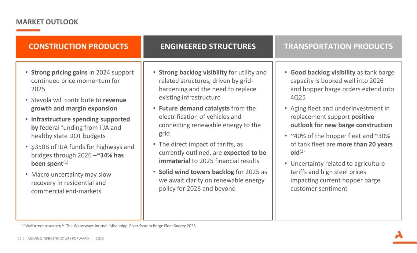 See Adjusted EBITDA reconciliation in Appendix. MAY 7, 2025: REAFFIRM 2025 GUIDANCE 439 8 FY-24 2025 Guidance 447 545 - 595 +30% +28% Adjusted EBITDA ($M) 21 I MOVING INFRASTRUCTURE FORWARD I 2025 Margin, excl. Steel Components 17.7% 2,482 88 FY-24 2025 Guidance 2,570 2,800 – 3,000 +17% +13% Revenues ($M) Steel Components 19.7% Steel Components We expect double-digit revenue and Adjusted EBITDA growth in 2025, inclusive of direct tariff impacts, as currently outlined, which are expected to be immaterial