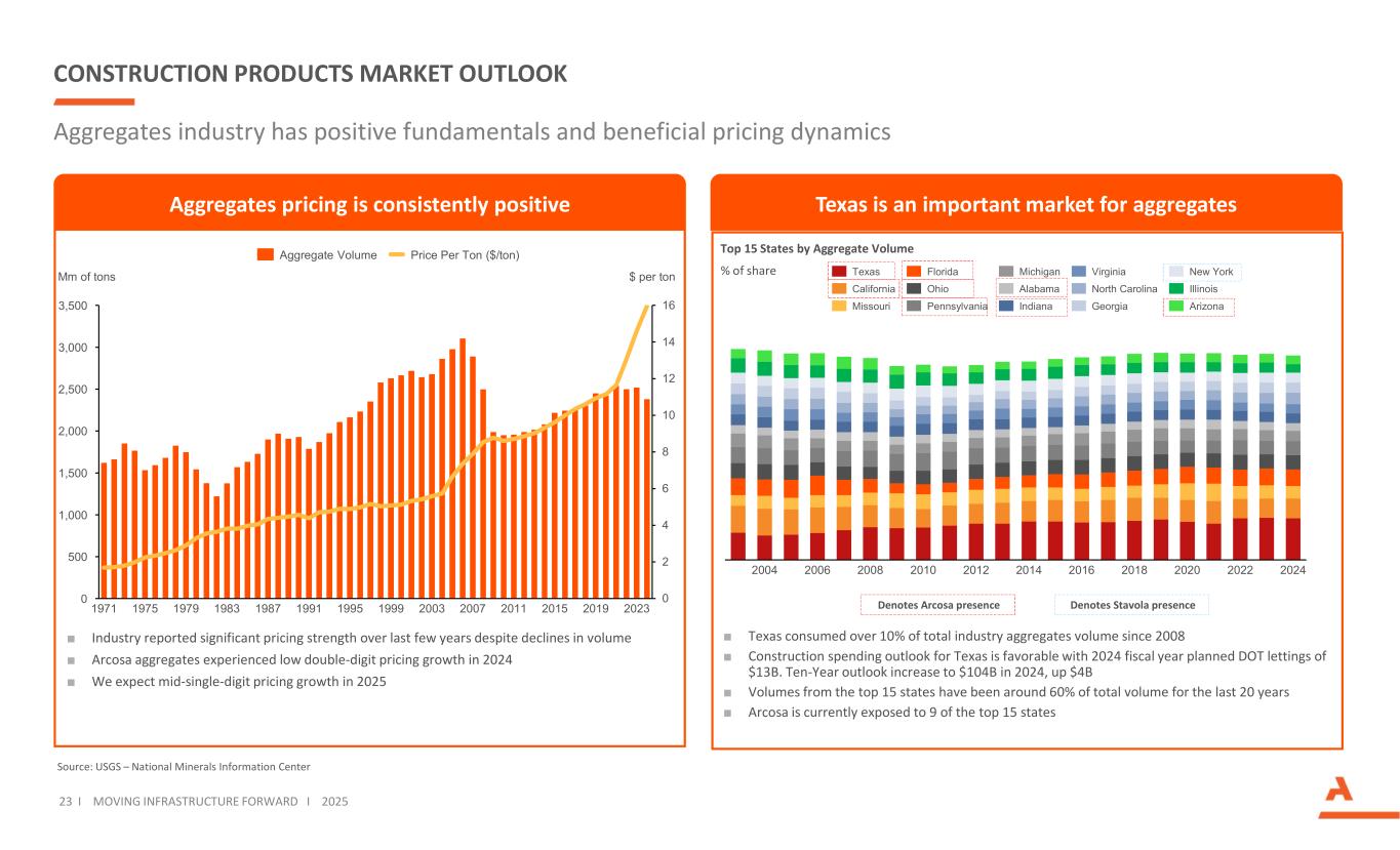 CONSTRUCTION PRODUCTS MARKET OUTLOOK 23 I MOVING INFRASTRUCTURE FORWARD I 2025 Source: USGS – National Minerals Information Center Aggregates industry has positive fundamentals and beneficial pricing dynamics Texas is an important market for aggregatesAggregates pricing is consistently positive ■ Industry reported significant pricing strength over last few years despite declines in volume ■ Arcosa aggregates experienced low double-digit pricing growth in 2024 ■ We expect mid-single-digit pricing growth in 2025 Top 15 States by Aggregate Volume ■ Texas consumed over 10% of total industry aggregates volume since 2008 ■ Construction spending outlook for Texas is favorable with 2024 fiscal year planned DOT lettings of $13B. Ten-Year outlook increase to $104B in 2024, up $4B ■ Volumes from the top 15 states have been around 60% of total volume for the last 20 years ■ Arcosa is currently exposed to 9 of the top 15 states Denotes Arcosa presence Denotes Stavola presence % of share 0 2 4 6 8 10 12 14 16 0 500 1,000 1,500 2,000 2,500 3,000 3,500 Mm of tons $ per ton 1971 1975 1979 1983 1987 1991 1995 1999 2003 2007 2011 2015 2019 2023 Aggregate Volume Price Per Ton ($/ton) Texas California Missouri Florida Ohio Pennsylvania Michigan Alabama Indiana Virginia North Carolina Georgia New York Illinois Arizona 2004 2006 2008 2010 2012 2014 2016 2018 2020 2022 2024