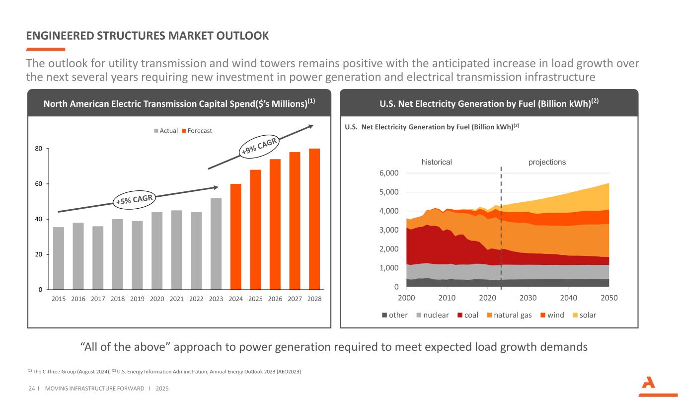 ENGINEERED STRUCTURES MARKET OUTLOOK 24 I MOVING INFRASTRUCTURE FORWARD I 2025 (1) The C Three Group (August 2024); (2) U.S. Energy Information Administration, Annual Energy Outlook 2023 (AEO2023) The outlook for utility transmission and wind towers remains positive with the anticipated increase in load growth over the next several years requiring new investment in power generation and electrical transmission infrastructure U.S. Net Electricity Generation by Fuel (Billion kWh)(2) Total U.S. and Canada Electric Transmission: Reported CAPEX ($B) North American Electric Transmission Capital Spend($’s Millions)(1) Total U.S. and Canada Electric Transmission: Reported CAPEX ($B) 0 20 40 60 80 2015 2016 2017 2018 2019 2020 2021 2022 2023 2024 2025 2026 2027 2028 Actual Forecast U.S. Net Electricity Generation by Fuel (Billion kWh)(2) 0 1,000 2,000 3,000 4,000 5,000 6,000 2000 2010 2020 2030 2040 2050 other nuclear coal natural gas wind solar historical projections “All of the above” approach to power generation required to meet expected load growth demands