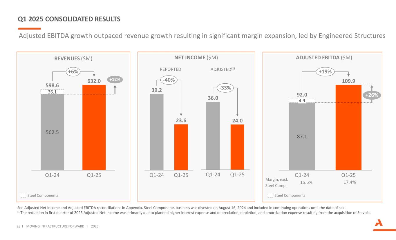 STRONG TRACK RECORD OF GROWTH AND MARGIN EXPANSION WHILE TRANSFORMING PORTFOLIO (1)Margin excludes the gain on land sale in 2023. See Adjusted EBITDA and Adjusted Segment EBITDA reconciliations in Appendix. 27 I MOVING INFRASTRUCTURE FORWARD I 2025 73 92 138 180 199 223 282 278 82 129 116 125 149 159 64 64 78 24 27 116 64 183 -32 -44 -48 -46 -50 62 -58 61 -55 -58 FY 2018 2019 2020 2021 2022 22 2023 2024 LTM 1Q 2025 187 241 284 283 325 368 447 465 14% ADJUSTED EBITDA ($M) Transportation Products Engineered Structures Gain on land sale Construction Products Corporate Margin 12.8% 17.4%13.9% 14.7% 13.9% 14.5% 15.1%(1) 17.9%