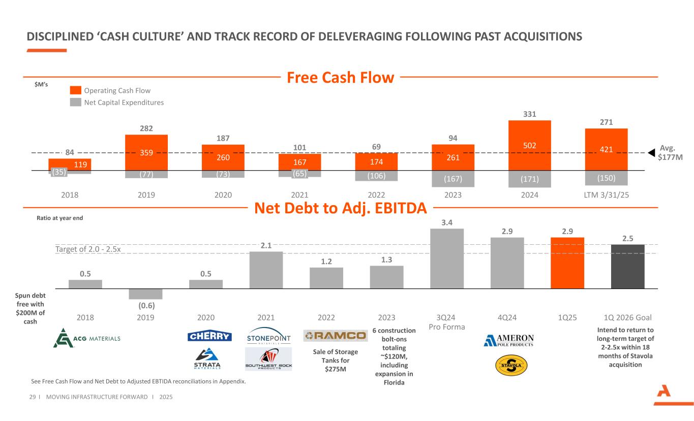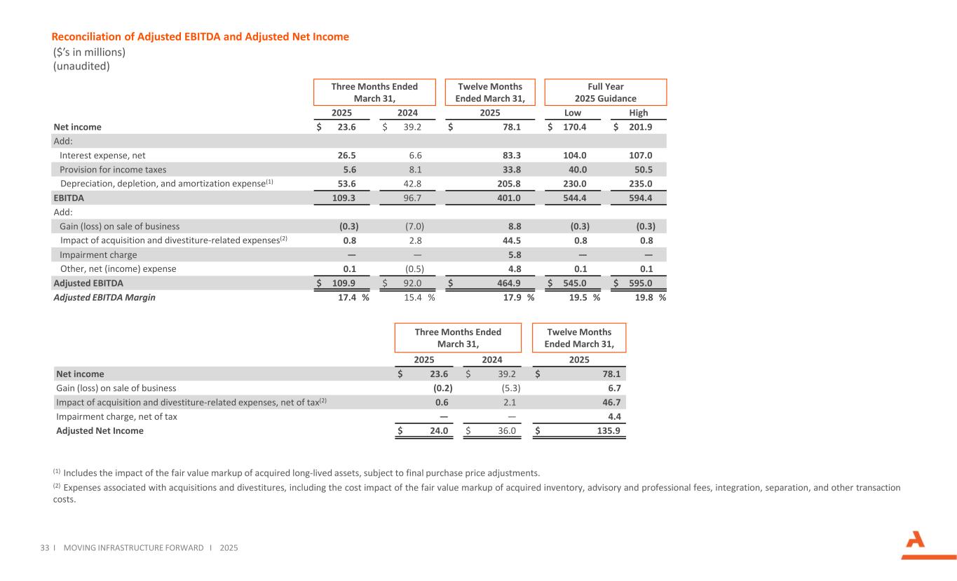 Reconciliation of Adjusted EBITDA and Adjusted Net Income 33 Moving Infrastructure Forward (1) Includes the impact of the fair value markup of acquired long-lived assets, subject to final purchase price adjustments. (2) Expenses associated with acquisitions and divestitures, including the cost impact of the fair value markup of acquired inventory, advisory and professional fees, integration, separation, and other transaction costs. ($’s in millions) (unaudited) I MOVING INFRASTRUCTURE FORWARD I 2025 Full Year 2025 Guidance Twelve Months Ended March 31, Three Months Ended March 31, HighLow202520242025 $ 201.9$ 170.4$ 78.1$ 39.2$ 23.6Net income Add: 107.0104.083.36.626.5Interest expense, net 50.540.033.88.15.6Provision for income taxes 235.0230.0205.842.853.6Depreciation, depletion, and amortization expense(1) 594.4544.4401.096.7109.3EBITDA Add: (0.3)(0.3)8.8(7.0)(0.3)Gain (loss) on sale of business 0.80.844.52.80.8Impact of acquisition and divestiture-related expenses(2) ——5.8——Impairment charge 0.10.14.8(0.5)0.1Other, net (income) expense $ 595.0$ 545.0$ 464.9$ 92.0$ 109.9Adjusted EBITDA 19.8 %19.5 %17.9 %15.4 %17.4 %Adjusted EBITDA Margin Twelve Months Ended March 31, Three Months Ended March 31, 202520242025 $ 78.1$ 39.2$ 23.6Net income 6.7(5.3)(0.2)Gain (loss) on sale of business 46.72.10.6Impact of acquisition and divestiture-related expenses, net of tax(2) 4.4——Impairment charge, net of tax $ 135.9$ 36.0$ 24.0Adjusted Net Income