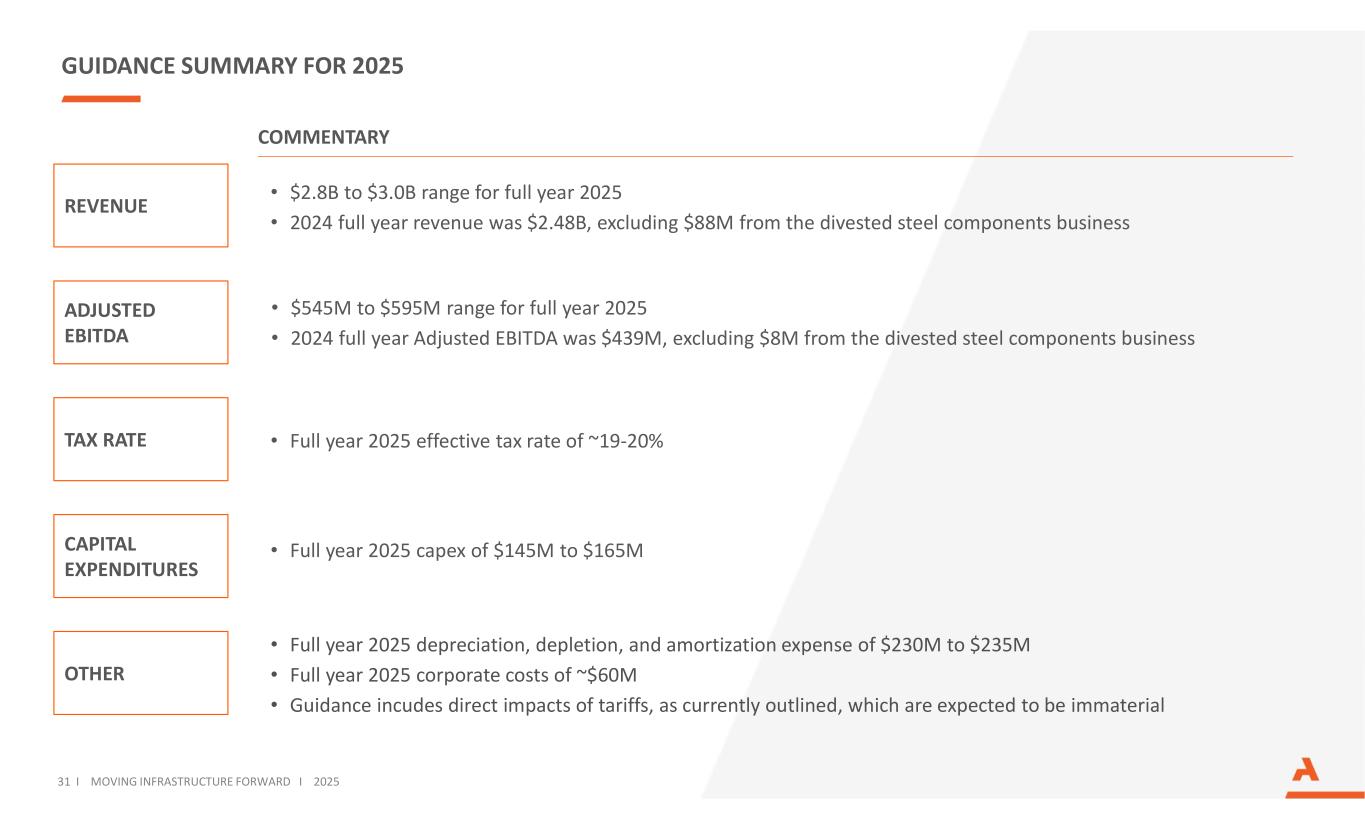 GUIDANCE SUMMARY FOR 2025 ADJUSTED EBITDA COMMENTARY CAPITAL EXPENDITURES OTHER • $545M to $595M range for full year 2025 • 2024 full year Adjusted EBITDA was $439M, excluding $8M from the divested steel components business • Full year 2025 capex of $145M to $165M TAX RATE • Full year 2025 effective tax rate of ~19-20% REVENUE • $2.8B to $3.0B range for full year 2025 • 2024 full year revenue was $2.48B, excluding $88M from the divested steel components business 31 I MOVING INFRASTRUCTURE FORWARD I 2025 • Full year 2025 depreciation, depletion, and amortization expense of $230M to $235M • Full year 2025 corporate costs of ~$60M • Guidance incudes direct impacts of tariffs, as currently outlined, which are expected to be immaterial