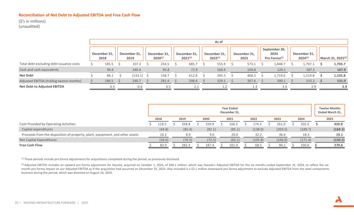 35 Moving Infrastructure ForwardI MOVING INFRASTRUCTURE FORWARD I 2025 Reconciliation of Net Debt to Adjusted EBITDA and Free Cash Flow ($’s in millions) (unaudited) (1) These periods include pro forma adjustments for acquisitions completed during the period, as previously disclosed. (2) Adjusted EBITDA includes an upward pro forma adjustment for Stavola, acquired on October 1, 2024, of $69.2 million, which was Stavola's Adjusted EBITDA for the six months ended September 31, 2024, to reflect the six- month pro forma impact on our Adjusted EBITDA as if the acquisition had occurred on December 31, 2023. Also included is a $3.1 million downward pro forma adjustment to exclude Adjusted EBITDA from the steel components business during the period, which was divested on August 16, 2024. As of March 31, 2025(2) December 31, 2024(1) September 30, 2024 Pro Forma(1) December 31, 2023 December 31, 2022(1) December 31, 2021(1) December 31, 2020(1) December 31, 2019 December 31, 2018 $ 1,703.7$ 1,707.1$ 1,848.7$ 573.1$ 555.9$ 685.7$ 254.5$ 107.3$ 185.5Total debt excluding debt issuance costs 167.9187.3129.1104.8160.472.995.8240.499.4Cash and cash equivalents $ 1,535.8$ 1,519.8$ 1,719.6$ 468.3$ 395.5$ 612.8$ 158.7$ (133.1)$ 86.1Net Debt $ 531.0$ 515.2$ 500.1$ 367.6$ 329.1$ 298.4$ 291.4$ 240.7$ 186.5Adjusted EBITDA (trailing twelve months) 2.92.93.41.31.22.10.5-0.60.5Net Debt to Adjusted EBITDA Twelve Months Ended March 31, Year Ended December 31, 20252024202320222021202020192018 $ 420.8$ 502.0$ 261.0$ 174.3$ 166.5$ 259.9$ 358.8$ 118.5Cash Provided by Operating Activities (169.3)(189.7)(203.5)(138.0)(85.1)(82.1)(85.4)(44.8)Capital expenditures 19.118.336.632.220.09.68.910.2Proceeds from the disposition of property, plant, equipment, and other assets (150.2)(171.4)(166.9)(105.8)(65.1)(72.5)(76.5)(34.6)Net Capital Expenditures $ 270.6$ 330.6$ 94.1$ 68.5$ 101.4$ 187.4$ 282.3$ 83.9Free Cash Flow