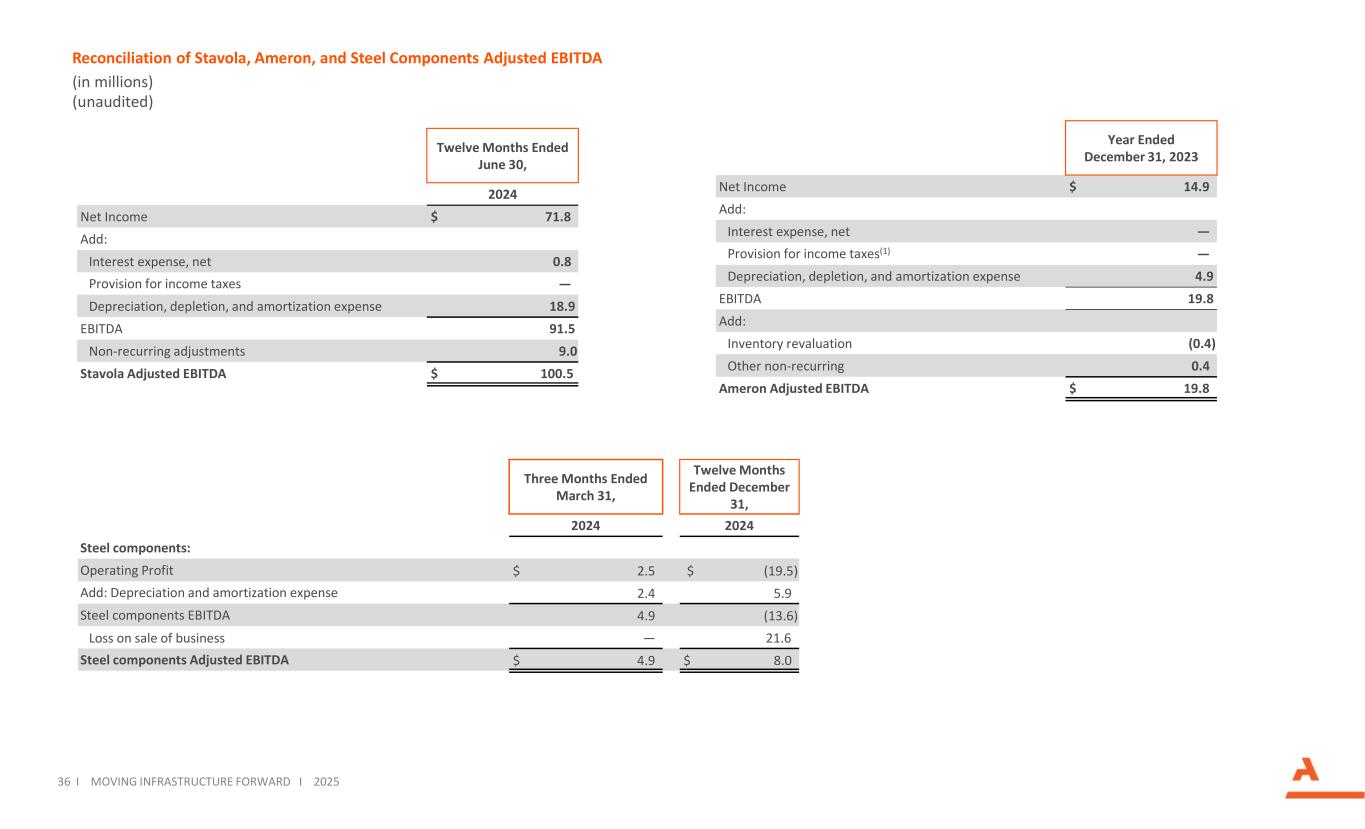 36 Moving Infrastructure ForwardI MOVING INFRASTRUCTURE FORWARD I 2025 Reconciliation of Stavola, Ameron, and Steel Components Adjusted EBITDA (in millions) (unaudited) Twelve Months Ended June 30, 2024 $ 71.8Net Income Add: 0.8Interest expense, net —Provision for income taxes 18.9Depreciation, depletion, and amortization expense 91.5EBITDA 9.0 Non-recurring adjustments $ 100.5Stavola Adjusted EBITDA Year Ended December 31, 2023 $ 14.9Net Income Add: —Interest expense, net —Provision for income taxes(1) 4.9Depreciation, depletion, and amortization expense 19.8EBITDA Add: (0.4)Inventory revaluation 0.4Other non-recurring $ 19.8Ameron Adjusted EBITDA Twelve Months Ended December 31, Three Months Ended March 31, 20242024 Steel components: $ (19.5)$ 2.5Operating Profit 5.92.4Add: Depreciation and amortization expense (13.6)4.9Steel components EBITDA 21.6—Loss on sale of business $ 8.0$ 4.9Steel components Adjusted EBITDA