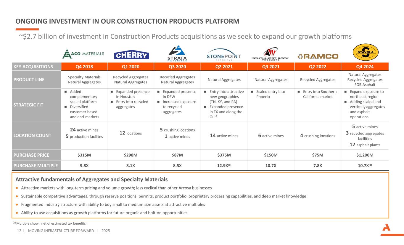 ~$2.7 billion of investment in Construction Products acquisitions as we seek to expand our growth platforms 12 I MOVING INFRASTRUCTURE FORWARD I 2025 ONGOING INVESTMENT IN OUR CONSTRUCTION PRODUCTS PLATFORM Q4 2024Q2 2022Q3 2021Q2 2021Q3 2020Q1 2020Q4 2018KEY ACQUISITIONS Natural Aggregates Recycled Aggregates FOB Asphalt Recycled AggregatesNatural AggregatesNatural AggregatesRecycled Aggregates Natural Aggregates Recycled Aggregates Natural Aggregates Specialty Materials Natural AggregatesPRODUCT LINE  Expand exposure to northeast region  Adding scaled and vertically aggregates and asphalt operations  Entry into Southern California market  Scaled entry into Phoenix  Entry into attractive new geographies (TN, KY, and PA)  Expanded presence in TX and along the Gulf  Expanded presence in DFW  Increased exposure to recycled aggregates  Expanded presence in Houston  Entry into recycled aggregates  Added complementary scaled platform  Diversified customer based and end-markets STRATEGIC FIT 5 active mines 3 recycled aggregates facilities 12 asphalt plants 4 crushing locations6 active mines14 active mines 5 crushing locations 1 active mines 12 locations 24 active mines 5 production facilitesLOCATION COUNT $1,200M$75M$150M$375M$87M$298M$315MPURCHASE PRICE 10.7X(1)7.8X10.7X12.9X(1)8.5X8.1X9.8XPURCHASE MULTIPLE Attractive fundamentals of Aggregates and Specialty Materials ● Attractive markets with long-term pricing and volume growth; less cyclical than other Arcosa businesses ● Sustainable competitive advantages, through reserve positions, permits, product portfolio, proprietary processing capabilities, and deep market knowledge ● Fragmented industry structure with ability to buy small to medium size assets at attractive multiples ● Ability to use acquisitions as growth platforms for future organic and bolt-on opportunities (1) Multiple shown net of estimated tax benefits