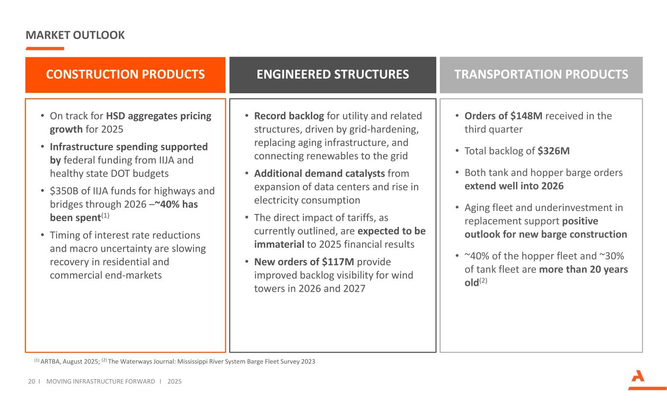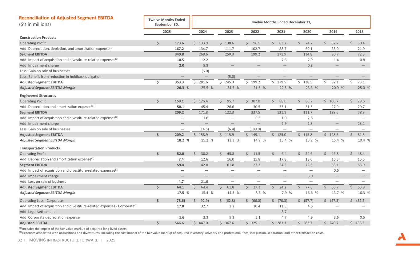 32 Moving Infrastructure ForwardI MOVING INFRASTRUCTURE FORWARD I 2025 Reconciliation of Adjusted Segment EBITDA (1) Includes the impact of the fair value markup of acquired long-lived assets. (2) Expenses associated with acquisitions and divestitures, including the cost impact of the fair value markup of acquired inventory, advisory and professional fees, integration, separation, and other transaction costs. ($’s in millions) (unaudited) Twelve Months Ended December 31,Twelve Months Ended September 30, 20182019202020212022202320242025 Construction Products $ 50.4$ 52.7$ 74.7$ 83.2$ 96.5$ 138.6$ 133.9$ 173.6Operating Profit 21.938.060.188.7102.7111.7134.7167.2Add: Depreciation, depletion, and amortization expense(1) 72.390.7134.8171.9199.2250.3268.6340.8Segment EBITDA 0.81.42.97.6——12.210.5Add: Impact of acquisition and divestiture-related expenses(2) ——0.8———5.82.0Add: Impairment charge ——————(5.0)—Less: Gain on sale of businesses —————(5.0)——Less: Benefit from reduction in holdback obligation $ 73.1$ 92.1$ 138.5$ 179.5$ 199.2$ 245.3$ 281.6$ 353.3Adjusted Segment EBITDA 25.0 %20.9 %23.3 %22.5 %21.6 %24.5 %25.5 %26.3 %Adjusted Segment EBITDA Margin Engineered Structures $ 28.6$ 100.7$ 80.2$ 88.0$ 307.0$ 95.7$ 126.4$ 159.1Operating Profit 29.727.931.533.130.526.645.450.1Add: Depreciation and amortization expense(1) 58.3128.6111.7121.1337.5122.3171.8209.2Segment EBITDA ——2.81.00.6—1.6—Add: Impact of acquisition and divestiture-related expenses(2) 23.2—1.32.9————Add: Impairment charge ————(189.0)(6.4)(14.5)—Less: Gain on sale of businesses $ 81.5$ 128.6$ 115.8$ 125.0$ 149.1$ 115.9$ 158.9$ 209.2Adjusted Segment EBITDA 10.4 %15.4 %13.2 %13.4 %14.9 %13.3 %15.2 %18.2 %Adjusted Segment EBITDA Margin Transportation Products $ 48.4$ 46.8$ 54.6$ 6.4$ 11.5$ 45.8$ 30.2$ 52.0Operating Profit 15.516.318.017.815.816.012.67.4Add: Depreciation and amortization expense(1) 63.963.172.624.227.361.842.859.4Segment EBITDA —0.6——————Add: Impact of acquisition and divestiture-related expenses(2) ——5.0—————Add: Impairment charge ——————21.64.7Add: Loss on sale of business $ 63.9$ 63.7$ 77.6$ 24.2$ 27.3$ 61.8$ 64.4$ 64.1Adjusted Segment EBITDA 16.3 %13.7 %16.6 %7.9 %8.6 %14.3 %15.4 %17.5 %Adjusted Segment EBITDA Margin $ (32.5)$ (47.3)$ (57.7)$ (70.3)$ (66.0)$ (62.8)$ (92.9)$ (78.6)Operating Loss - Corporate ——4.611.510.42.232.717.0Add: Impact of acquisition and divestiture-related expenses - Corporate(2) ———8.7————Add: Legal settlement 0.53.64.94.75.15.22.31.6Add: Corporate depreciation expense $ 186.5$ 240.7$ 283.7$ 283.3$ 325.1$ 367.6$ 447.0$ 566.6Adjusted EBITDA