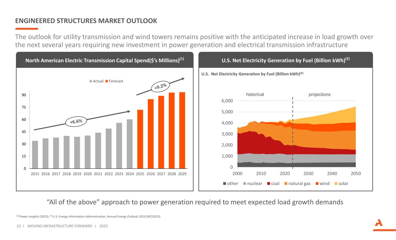 ENGINEERED STRUCTURES MARKET OUTLOOK 22 I MOVING INFRASTRUCTURE FORWARD I 2025 (1) Power Insights (2025); (2) U.S. Energy Information Administration, Annual Energy Outlook 2023 (AEO2023) The outlook for utility transmission and wind towers remains positive with the anticipated increase in load growth over the next several years requiring new investment in power generation and electrical transmission infrastructure U.S. Net Electricity Generation by Fuel (Billion kWh)(2) Total U.S. and Canada Electric Transmission: Reported CAPEX ($B) North American Electric Transmission Capital Spend($’s Millions)(1) Total U.S. and Canada Electric Transmission: Reported CAPEX ($B) 0 15 30 45 60 75 90 2015 2016 2017 2018 2019 2020 2021 2022 2023 2024 2025 2026 2027 2028 2029 Actual Forecast U.S. Net Electricity Generation by Fuel (Billion kWh)(2) 0 1,000 2,000 3,000 4,000 5,000 6,000 2000 2010 2020 2030 2040 2050 other nuclear coal natural gas wind solar historical projections “All of the above” approach to power generation required to meet expected load growth demands