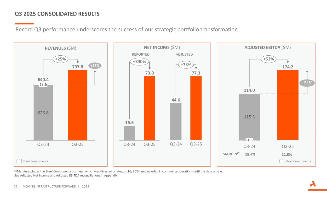 Q3 2025 CONSOLIDATED RESULTS (1)Margin excludes the Steel Components business, which was divested on August 16, 2024 and included in continuing operations until the date of sale. See Adjusted Net Income and Adjusted EBITDA reconciliations in Appendix. REVENUES ($M) ADJUSTED EBITDA ($M) 26 I MOVING INFRASTRUCTURE FORWARD I 2025 MARGIN(1) 18.4% 21.8% REPORTED ADJUSTED NET INCOME ($M) 16.6 73.0 Q3-24 Q3-25 +340% 44.6 77.3 Q3-24 Q3-25 +73% 626.8 797.8 13.6 Q3-24 Q3-25 640.4 +27% +25% Steel Components 115.3 174.2 -1.3 Q3-24 Q3-25 114.0 +51% +53% Steel Components Record Q3 performance underscores the success of our strategic portfolio transformation