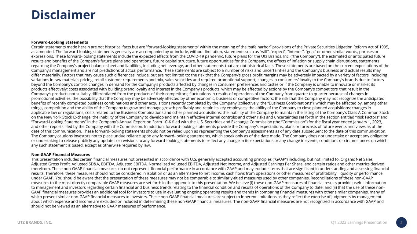 UTZ BRANDS, INC. Q1 2023 Earnings Presentation 2 Disclaimer Forward-Looking Statements Certain statements made herein are not historical facts but are “forward-looking statements” within the meaning of the “safe harbor” provisions of the Private Securities Litigation Reform Act of 1995, as amended. The forward-looking statements generally are accompanied by or include, without limitation, statements such as “will”, “expect”, “intends”, “goal” or other similar words, phrases or expressions. These forward-looking statements include the expected effects from the COVID-19 pandemic, future plans for the Utz Brands, Inc. (“the Company”), the estimated or anticipated future results and benefits of the Company’s future plans and operations, future capital structure, future opportunities for the Company, the effects of inflation or supply chain disruptions, statements regarding the Company’s project balance sheet and liabilities, including net leverage, and other statements that are not historical facts. These statements are based on the current expectations of the Company’s management and are not predictions of actual performance. These statements are subject to a number of risks and uncertainties and the Company’s business and actual results may differ materially. Factors that may cause such differences include, but are not limited to: the risk that the Company’s gross profit margins may be adversely impacted by a variety of factors, including variations in raw materials pricing, retail customer requirements and mix, sales velocities and required promotional support; changes in consumers’ loyalty to the Company’s brands due to factors beyond the Company’s control; changes in demand for the Company’s products affected by changes in consumer preferences and tastes or if the Company is unable to innovate or market its products effectively; costs associated with building brand loyalty and interest in the Company’s products, which may be affected by actions by the Company’s competitors’ that result in the Company’s products not suitably differentiated from the products of their competitors; fluctuations in results of operations of the Company from quarter to quarter because of changes in promotional activities; the possibility that the Company may be adversely affected by other economic, business or competitive factors; the risk that the Company may not recognize the anticipated benefits of recently completed business combinations and other acquisitions recently completed by the Company (collectively, the “Business Combinations”), which may be affected by, among other things, competition and the ability of the Company to grow and manage growth profitably and retain its key employees; the ability of the Company to close planned acquisitions; changes in applicable law or regulations; costs related to the Business Combinations and other planned acquisitions; the inability of the Company to maintain the listing of the Company’s Class A Common Stock on the New York Stock Exchange; the inability of the Company to develop and maintain effective internal controls; and other risks and uncertainties set forth in the section entitled “Risk Factors” and “Forward-Looking Statements” in the Company’s Annual Report on Form 10-K filed with the U.S. Securities and Exchange Commission (the “Commission”) for the fiscal year ended January 1, 2023, and other reports filed by the Company with the Commission. In addition, forward-looking statements provide the Company’s expectations, plans or forecasts of future events and views as of the date of this communication. These forward-looking statements should not be relied upon as representing the Company’s assessments as of any date subsequent to the date of this communication. The Company cautions investors not to place undue reliance upon any forward-looking statements, which speak only as of the date made. The Company does not undertake or accept any obligation or undertaking to release publicly any updates or revisions to any forward-looking statements to reflect any change in its expectations or any change in events, conditions or circumstances on which any such statement is based, except as otherwise required by law. Non-GAAP Financial Measures This presentation includes certain financial measures not presented in accordance with U.S. generally accepted accounting principles (“GAAP”) including, but not limited to, Organic Net Sales, Adjusted Gross Profit, Adjusted SD&A, EBITDA, Adjusted EBITDA, Normalized Adjusted EBITDA, Adjusted Net Income, and Adjusted Earnings Per Share, and certain ratios and other metrics derived therefrom. These non-GAAP financial measures do not represent financial performance in accordance with GAAP and may exclude items that are significant in understanding and assessing financial results. Therefore, these measures should not be considered in isolation or as an alternative to net income, cash flows from operations or other measures of profitability, liquidity or performance under GAAP. You should be aware that the presentation of these measures may not be comparable to similarly-titled measures used by other companies. Reconciliations of these non-GAAP measures to the most directly comparable GAAP measures are set forth in the appendix to this presentation. We believe (i) these non-GAAP measures of financial results provide useful information to management and investors regarding certain financial and business trends relating to the financial condition and results of operations of the Company to date; and (ii) that the use of these non- GAAP financial measures provides an additional tool for investors to use in evaluating ongoing operating results and trends in comparing financial measures with other similar companies, many of which present similar non-GAAP financial measures to investors. These non-GAAP financial measures are subject to inherent limitations as 