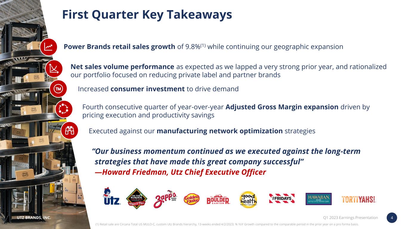 UTZ BRANDS, INC. Q1 2023 Earnings Presentation 2 Disclaimer Forward-Looking Statements Certain statements made herein are not historical facts but are “forward-looking statements” within the meaning of the “safe harbor” provisions of the Private Securities Litigation Reform Act of 1995, as amended. The forward-looking statements generally are accompanied by or include, without limitation, statements such as “will”, “expect”, “intends”, “goal” or other similar words, phrases or expressions. These forward-looking statements include the expected effects from the COVID-19 pandemic, future plans for the Utz Brands, Inc. (“the Company”), the estimated or anticipated future results and benefits of the Company’s future plans and operations, future capital structure, future opportunities for the Company, the effects of inflation or supply chain disruptions, statements regarding the Company’s project balance sheet and liabilities, including net leverage, and other statements that are not historical facts. These statements are based on the current expectations of the Company’s management and are not predictions of actual performance. These statements are subject to a number of risks and uncertainties and the Company’s business and actual results may differ materially. Factors that may cause such differences include, but are not limited to: the risk that the Company’s gross profit margins may be adversely impacted by a variety of factors, including variations in raw materials pricing, retail customer requirements and mix, sales velocities and required promotional support; changes in consumers’ loyalty to the Company’s brands due to factors beyond the Company’s control; changes in demand for the Company’s products affected by changes in consumer preferences and tastes or if the Company is unable to innovate or market its products effectively; costs associated with building brand loyalty and interest in the Company’s products, which may be affected by actions by the Company’s competitors’ that result in the Company’s products not suitably differentiated from the products of their competitors; fluctuations in results of operations of the Company from quarter to quarter because of changes in promotional activities; the possibility that the Company may be adversely affected by other economic, business or competitive factors; the risk that the Company may not recognize the anticipated benefits of recently completed business combinations and other acquisitions recently completed by the Company (collectively, the “Business Combinations”), which may be affected by, among other things, competition and the ability of the Company to grow and manage growth profitably and retain its key employees; the ability of the Company to close planned acquisitions; changes in applicable law or regulations; costs related to the Business Combinations and other planned acquisitions; the inability of the Company to maintain the listing of the Company’s Class A Common Stock on the New York Stock Exchange; the inability of the Company to develop and maintain effective internal controls; and other risks and uncertainties set forth in the section entitled “Risk Factors” and “Forward-Looking Statements” in the Company’s Annual Report on Form 10-K filed with the U.S. Securities and Exchange Commission (the “Commission”) for the fiscal year ended January 1, 2023, and other reports filed by the Company with the Commission. In addition, forward-looking statements provide the Company’s expectations, plans or forecasts of future events and views as of the date of this communication. These forward-looking statements should not be relied upon as representing the Company’s assessments as of any date subsequent to the date of this communication. The Company cautions investors not to place undue reliance upon any forward-looking statements, which speak only as of the date made. The Company does not undertake or accept any obligation or undertaking to release publicly any updates or revisions to any forward-looking statements to reflect any change in its expectations or any change in events, conditions or circumstances on which any such statement is based, except as otherwise required by law. Non-GAAP Financial Measures This presentation includes certain financial measures not presented in accordance with U.S. generally accepted accounting principles (“GAAP”) including, but not limited to, Organic Net Sales, Adjusted Gross Profit, Adjusted SD&A, EBITDA, Adjusted EBITDA, Normalized Adjusted EBITDA, Adjusted Net Income, and Adjusted Earnings Per Share, and certain ratios and other metrics derived therefrom. These non-GAAP financial measures do not represent financial performance in accordance with GAAP and may exclude items that are significant in understanding and assessing financial results. Therefore, these measures should not be considered in isolation or as an alternative to net income, cash flows from operations or other measures of profitability, liquidity or performance under GAAP. You should be aware that the presentation of these measures may not be comparable to similarly-titled measures used by other companies. Reconciliations of these non-GAAP measures to the most directly comparable GAAP measures are set forth in the appendix to this presentation. We believe (i) these non-GAAP measures of financial results provide useful information to management and investors regarding certain financial and business trends relating to the financial condition and results of operations of the Company to date; and (ii) that the use of these non- GAAP financial measures provides an additional tool for investors to use in evaluating ongoing operating results and trends in comparing financial measures with other similar companies, many of which present similar non-GAAP financial measures to investors. These non-GAAP financial measures are subject to inherent limitations as 