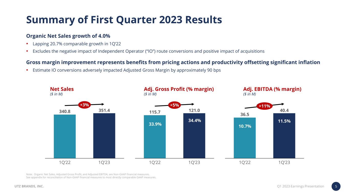 UTZ BRANDS, INC. Q1 2023 Earnings Presentation 2 Disclaimer Forward-Looking Statements Certain statements made herein are not historical facts but are “forward-looking statements” within the meaning of the “safe harbor” provisions of the Private Securities Litigation Reform Act of 1995, as amended. The forward-looking statements generally are accompanied by or include, without limitation, statements such as “will”, “expect”, “intends”, “goal” or other similar words, phrases or expressions. These forward-looking statements include the expected effects from the COVID-19 pandemic, future plans for the Utz Brands, Inc. (“the Company”), the estimated or anticipated future results and benefits of the Company’s future plans and operations, future capital structure, future opportunities for the Company, the effects of inflation or supply chain disruptions, statements regarding the Company’s project balance sheet and liabilities, including net leverage, and other statements that are not historical facts. These statements are based on the current expectations of the Company’s management and are not predictions of actual performance. These statements are subject to a number of risks and uncertainties and the Company’s business and actual results may differ materially. Factors that may cause such differences include, but are not limited to: the risk that the Company’s gross profit margins may be adversely impacted by a variety of factors, including variations in raw materials pricing, retail customer requirements and mix, sales velocities and required promotional support; changes in consumers’ loyalty to the Company’s brands due to factors beyond the Company’s control; changes in demand for the Company’s products affected by changes in consumer preferences and tastes or if the Company is unable to innovate or market its products effectively; costs associated with building brand loyalty and interest in the Company’s products, which may be affected by actions by the Company’s competitors’ that result in the Company’s products not suitably differentiated from the products of their competitors; fluctuations in results of operations of the Company from quarter to quarter because of changes in promotional activities; the possibility that the Company may be adversely affected by other economic, business or competitive factors; the risk that the Company may not recognize the anticipated benefits of recently completed business combinations and other acquisitions recently completed by the Company (collectively, the “Business Combinations”), which may be affected by, among other things, competition and the ability of the Company to grow and manage growth profitably and retain its key employees; the ability of the Company to close planned acquisitions; changes in applicable law or regulations; costs related to the Business Combinations and other planned acquisitions; the inability of the Company to maintain the listing of the Company’s Class A Common Stock on the New York Stock Exchange; the inability of the Company to develop and maintain effective internal controls; and other risks and uncertainties set forth in the section entitled “Risk Factors” and “Forward-Looking Statements” in the Company’s Annual Report on Form 10-K filed with the U.S. Securities and Exchange Commission (the “Commission”) for the fiscal year ended January 1, 2023, and other reports filed by the Company with the Commission. In addition, forward-looking statements provide the Company’s expectations, plans or forecasts of future events and views as of the date of this communication. These forward-looking statements should not be relied upon as representing the Company’s assessments as of any date subsequent to the date of this communication. The Company cautions investors not to place undue reliance upon any forward-looking statements, which speak only as of the date made. The Company does not undertake or accept any obligation or undertaking to release publicly any updates or revisions to any forward-looking statements to reflect any change in its expectations or any change in events, conditions or circumstances on which any such statement is based, except as otherwise required by law. Non-GAAP Financial Measures This presentation includes certain financial measures not presented in accordance with U.S. generally accepted accounting principles (“GAAP”) including, but not limited to, Organic Net Sales, Adjusted Gross Profit, Adjusted SD&A, EBITDA, Adjusted EBITDA, Normalized Adjusted EBITDA, Adjusted Net Income, and Adjusted Earnings Per Share, and certain ratios and other metrics derived therefrom. These non-GAAP financial measures do not represent financial performance in accordance with GAAP and may exclude items that are significant in understanding and assessing financial results. Therefore, these measures should not be considered in isolation or as an alternative to net income, cash flows from operations or other measures of profitability, liquidity or performance under GAAP. You should be aware that the presentation of these measures may not be comparable to similarly-titled measures used by other companies. Reconciliations of these non-GAAP measures to the most directly comparable GAAP measures are set forth in the appendix to this presentation. We believe (i) these non-GAAP measures of financial results provide useful information to management and investors regarding certain financial and business trends relating to the financial condition and results of operations of the Company to date; and (ii) that the use of these non- GAAP financial measures provides an additional tool for investors to use in evaluating ongoing operating results and trends in comparing financial measures with other similar companies, many of which present similar non-GAAP financial measures to investors. These non-GAAP financial measures are subject to inherent limitations as 