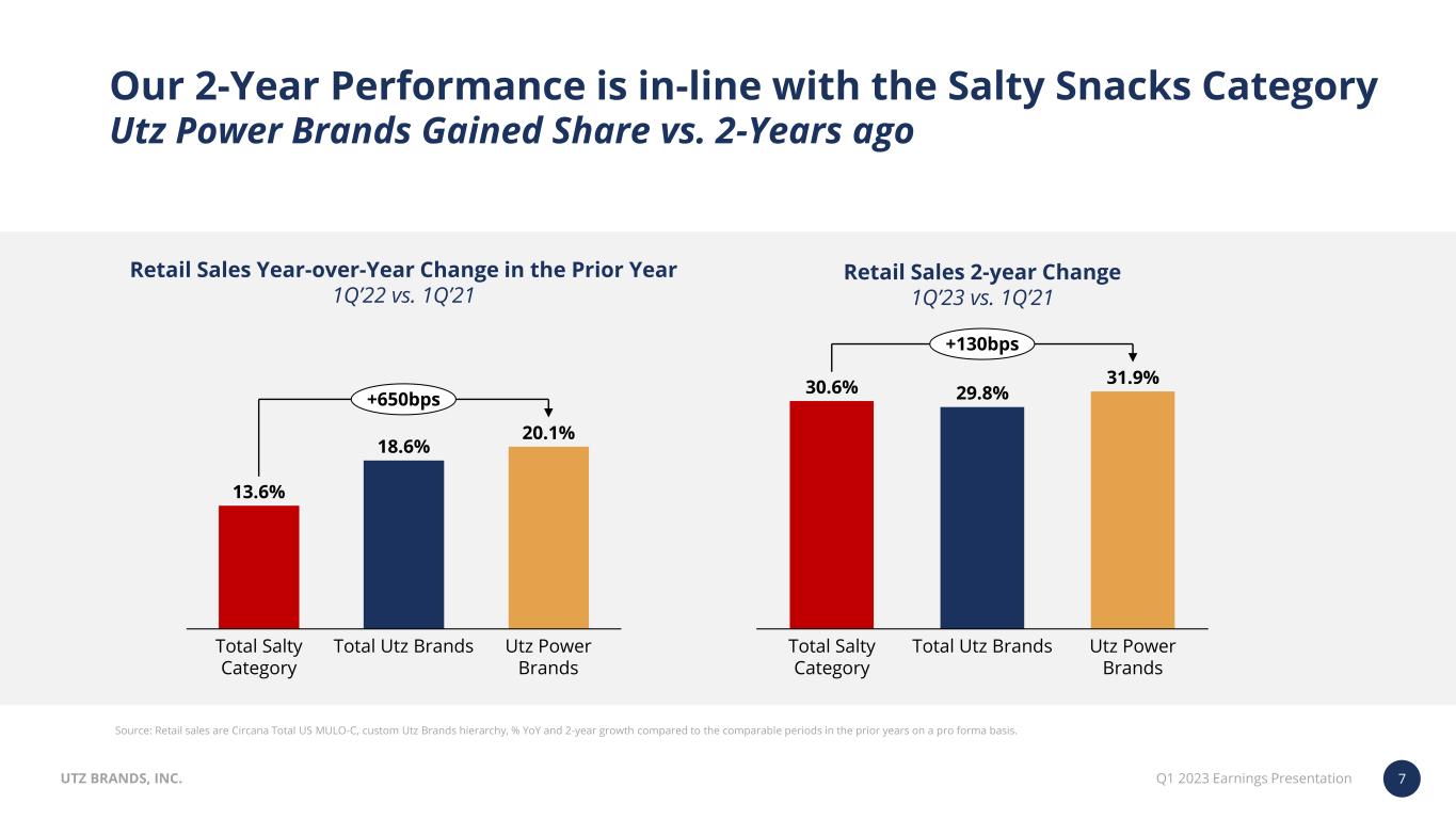 UTZ BRANDS, INC. Q1 2023 Earnings Presentation 6 First Quarter Retail Sales Overview UTZ POWER BRANDS RETAIL SALES GROWTH 9.8% IN 1Q’23 Retail Sales Year-over-Year Growth (13-Weeks Ended 4/2/23) Source: Retail sales are Circana Total US MULO-C, custom Utz Brands hierarchy, 13-weeks ended 4/2/2023; % YoY growth compared to the comparable period in the prior year on a pro forma basis. Utz Power Brands Total Salty Category Total Utz Brands 14.8% Utz Foundation Brands 9.8%9.4% 6.9% 49% 19% 6% 26% % of Total Retail Sales (13-Weeks Ended 4/2/23) +11% YoY Growth +4% YoY Growth All other brands +57% YoY Growth THREE LARGEST POWER BRANDS Double-digit growth IN 1Q’23 ~75% OF TOTAL 1Q’23 RETAIL SALES