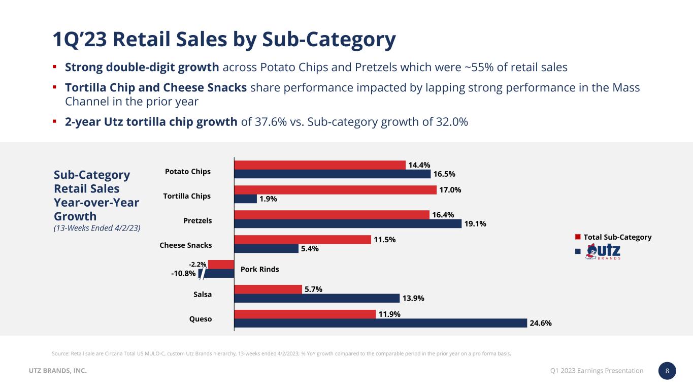 UTZ BRANDS, INC. Q1 2023 Earnings Presentation 7 Our 2-Year Performance is in-line with the Salty Snacks Category Total Salty Category Total Utz Brands 30.6% Utz Power Brands 29.8% 31.9% +130bps Retail Sales 2-year Change 1Q’23 vs. 1Q’21 Total Salty Category Total Utz Brands Utz Power Brands 13.6% 18.6% 20.1% +650bps Retail Sales Year-over-Year Change in the Prior Year 1Q’22 vs. 1Q’21 Source: Retail sales are Circana Total US MULO-C, custom Utz Brands hierarchy, % YoY and 2-year growth compared to the comparable periods in the prior years on a pro forma basis. Utz Power Brands Gained Share vs. 2-Years ago