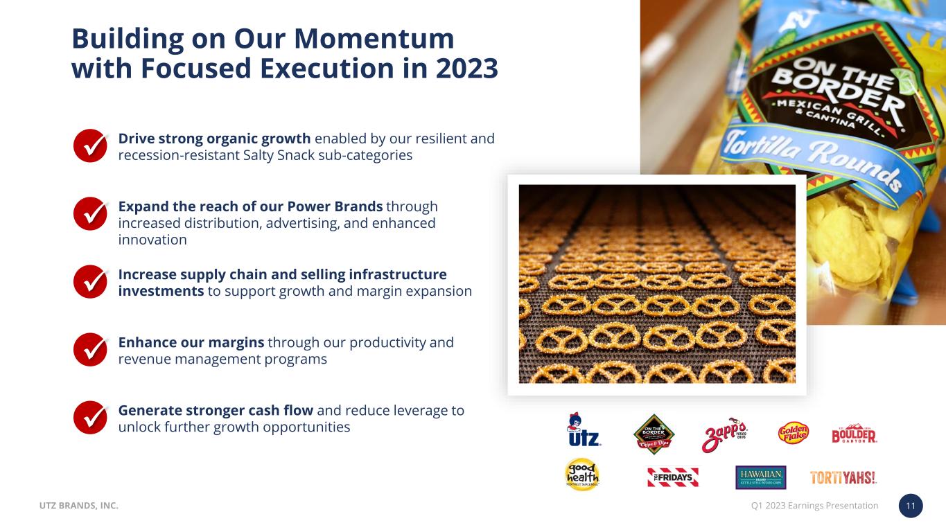 2023 Innovation Focus on Flavor & Occasions New Seasonal Offerings and Assortments in Multipacks Capturing Occasions Scaling Zapp’s Seasoned Pretzels and Utz Peanut Butter-filled Pretzels Pretzels + Flavor Hot & Spicy Limited Time Offerings and Line Extensions On-Trend Flavors UTZ BRANDS, INC. Q1 2023 Earnings Presentation 10