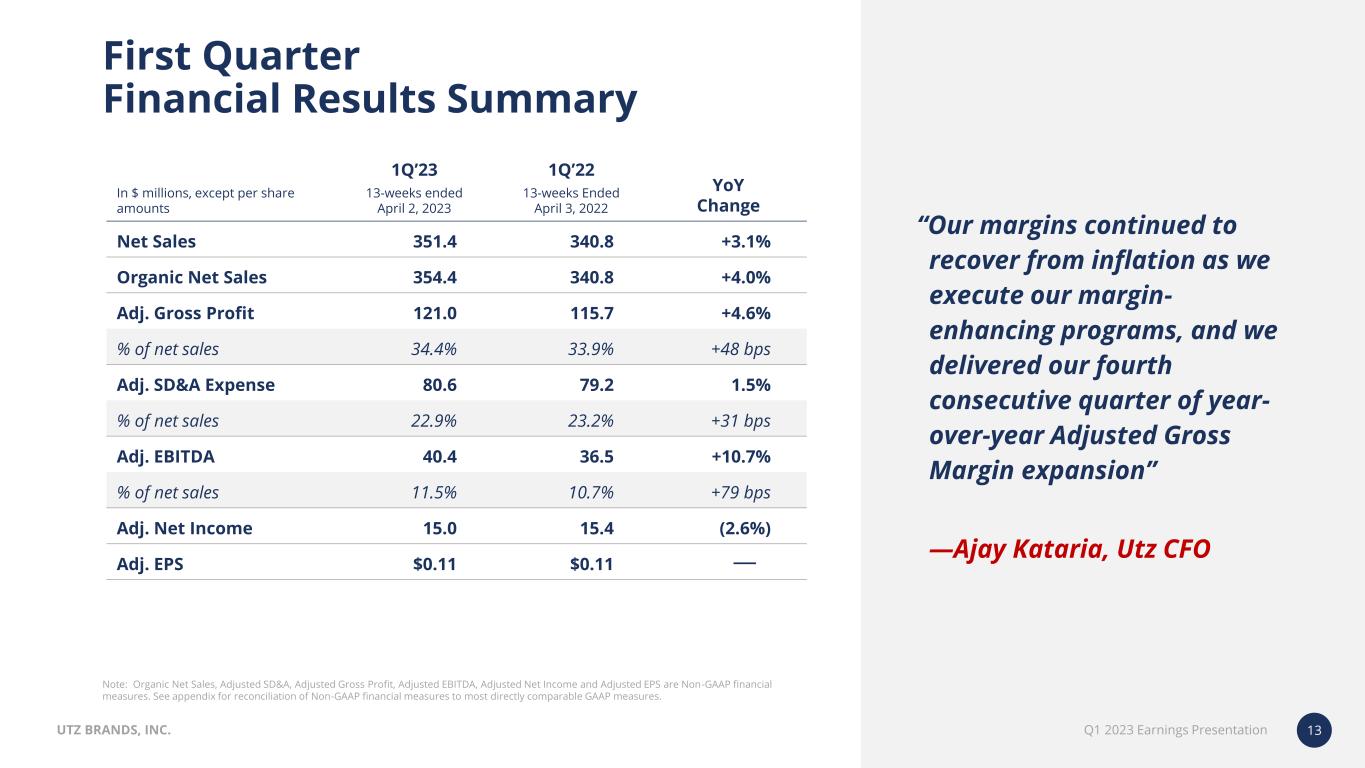 UTZ BRANDS, INC. Q1 2023 Earnings Presentation 2 Disclaimer Forward-Looking Statements Certain statements made herein are not historical facts but are “forward-looking statements” within the meaning of the “safe harbor” provisions of the Private Securities Litigation Reform Act of 1995, as amended. The forward-looking statements generally are accompanied by or include, without limitation, statements such as “will”, “expect”, “intends”, “goal” or other similar words, phrases or expressions. These forward-looking statements include the expected effects from the COVID-19 pandemic, future plans for the Utz Brands, Inc. (“the Company”), the estimated or anticipated future results and benefits of the Company’s future plans and operations, future capital structure, future opportunities for the Company, the effects of inflation or supply chain disruptions, statements regarding the Company’s project balance sheet and liabilities, including net leverage, and other statements that are not historical facts. These statements are based on the current expectations of the Company’s management and are not predictions of actual performance. These statements are subject to a number of risks and uncertainties and the Company’s business and actual results may differ materially. Factors that may cause such differences include, but are not limited to: the risk that the Company’s gross profit margins may be adversely impacted by a variety of factors, including variations in raw materials pricing, retail customer requirements and mix, sales velocities and required promotional support; changes in consumers’ loyalty to the Company’s brands due to factors beyond the Company’s control; changes in demand for the Company’s products affected by changes in consumer preferences and tastes or if the Company is unable to innovate or market its products effectively; costs associated with building brand loyalty and interest in the Company’s products, which may be affected by actions by the Company’s competitors’ that result in the Company’s products not suitably differentiated from the products of their competitors; fluctuations in results of operations of the Company from quarter to quarter because of changes in promotional activities; the possibility that the Company may be adversely affected by other economic, business or competitive factors; the risk that the Company may not recognize the anticipated benefits of recently completed business combinations and other acquisitions recently completed by the Company (collectively, the “Business Combinations”), which may be affected by, among other things, competition and the ability of the Company to grow and manage growth profitably and retain its key employees; the ability of the Company to close planned acquisitions; changes in applicable law or regulations; costs related to the Business Combinations and other planned acquisitions; the inability of the Company to maintain the listing of the Company’s Class A Common Stock on the New York Stock Exchange; the inability of the Company to develop and maintain effective internal controls; and other risks and uncertainties set forth in the section entitled “Risk Factors” and “Forward-Looking Statements” in the Company’s Annual Report on Form 10-K filed with the U.S. Securities and Exchange Commission (the “Commission”) for the fiscal year ended January 1, 2023, and other reports filed by the Company with the Commission. In addition, forward-looking statements provide the Company’s expectations, plans or forecasts of future events and views as of the date of this communication. These forward-looking statements should not be relied upon as representing the Company’s assessments as of any date subsequent to the date of this communication. The Company cautions investors not to place undue reliance upon any forward-looking statements, which speak only as of the date made. The Company does not undertake or accept any obligation or undertaking to release publicly any updates or revisions to any forward-looking statements to reflect any change in its expectations or any change in events, conditions or circumstances on which any such statement is based, except as otherwise required by law. Non-GAAP Financial Measures This presentation includes certain financial measures not presented in accordance with U.S. generally accepted accounting principles (“GAAP”) including, but not limited to, Organic Net Sales, Adjusted Gross Profit, Adjusted SD&A, EBITDA, Adjusted EBITDA, Normalized Adjusted EBITDA, Adjusted Net Income, and Adjusted Earnings Per Share, and certain ratios and other metrics derived therefrom. These non-GAAP financial measures do not represent financial performance in accordance with GAAP and may exclude items that are significant in understanding and assessing financial results. Therefore, these measures should not be considered in isolation or as an alternative to net income, cash flows from operations or other measures of profitability, liquidity or performance under GAAP. You should be aware that the presentation of these measures may not be comparable to similarly-titled measures used by other companies. Reconciliations of these non-GAAP measures to the most directly comparable GAAP measures are set forth in the appendix to this presentation. We believe (i) these non-GAAP measures of financial results provide useful information to management and investors regarding certain financial and business trends relating to the financial condition and results of operations of the Company to date; and (ii) that the use of these non- GAAP financial measures provides an additional tool for investors to use in evaluating ongoing operating results and trends in comparing financial measures with other similar companies, many of which present similar non-GAAP financial measures to investors. These non-GAAP financial measures are subject to inherent limitations as 