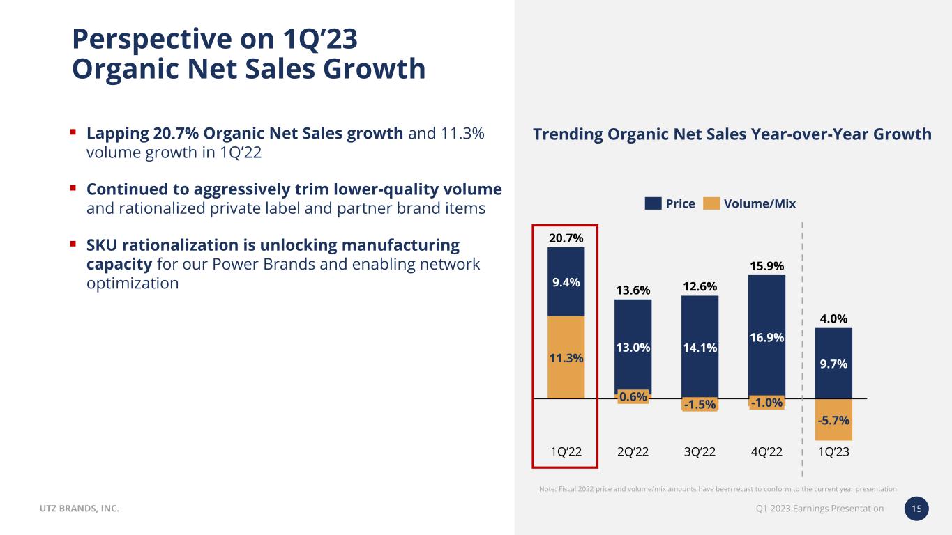 UTZ BRANDS, INC. Q1 2023 Earnings Presentation 14 ▪ Total net sales growth of 3.1% and Organic Net Sales growth of +4.0% ▪ Net price realization as a result of inflation- justified actions in fiscal 2022 ▪ Organic volume growth impacted by SKU rationalization focused on private label and certain partner brands that reduced volumes by approximately 4%, and lapping strong performance in the Mass Channel in the prior year ▪ Impact from conversion of company-owned direct store delivery (“DSD”) routes to IOs of (0.9%) 1Q’23 Net Sales Bridge 1Q’23 Net Sales YoY Growth Decomposition (1) Estimated impact due to conversion of employee-serviced DSD routes to independent operator-serviced routes. Price Volume/Mix -5.7% 0.0% 1Q’23 Organic Net Sales Growth Acquisitions 3.1% -0.9% IO Conversions 1Q’23 Total Net Sales Growth 9.7% 4.0% (1) Note: Organic Net Sales is a Non-GAAP financial measure. Note: See appendix for reconciliation of Non-GAAP financial measures to most directly comparable GAAP measures.
