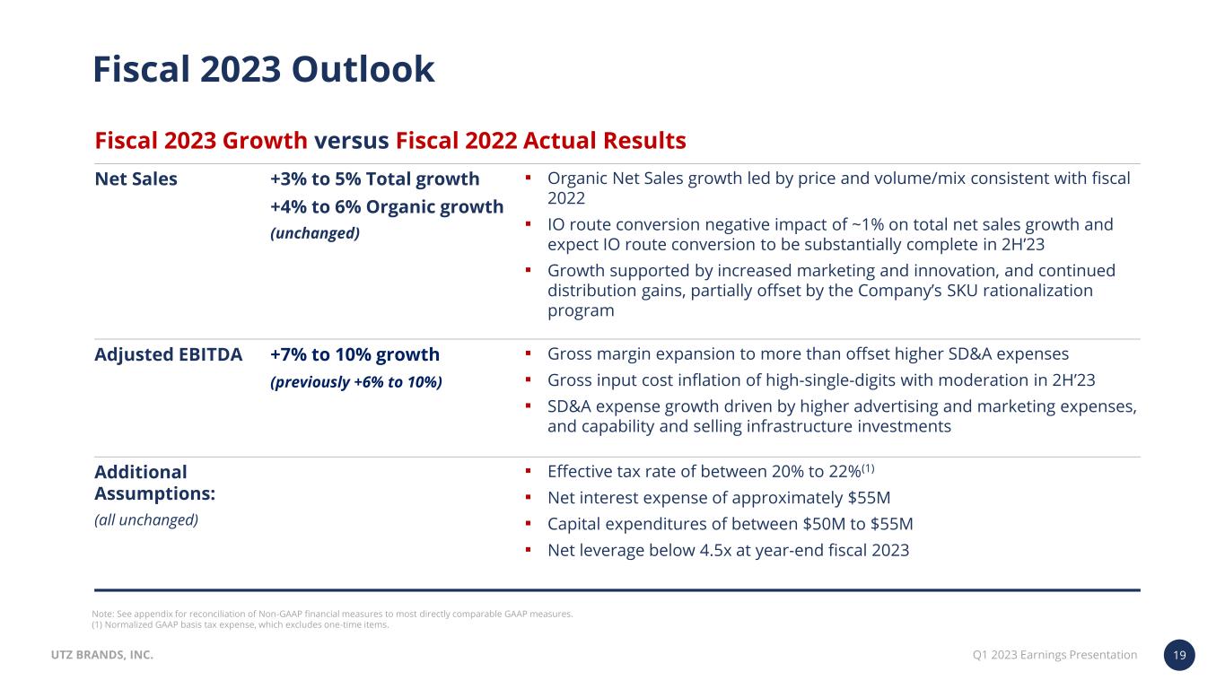 UTZ BRANDS, INC. Q1 2023 Earnings Presentation 18 Cash Flow and Balance Sheet Highlights Note: See appendix for reconciliation of Non-GAAP financial measures to most directly comparable GAAP measures. (1) Includes $3.4M of Distributions to Non-controlling Interest. (2) Includes Term Loan, ABL Facility and Capital Leases. Capital Leases include equipment term loans and excludes the impact of step-up accounting.​ (3) Net Leverage Ratio is a Non-GAAP financial measure and is based on Normalized Adjusted EBITDA of $174.5M. As of January 1, 2023 Cash Flow Highlights 13-Weeks Ended April 2, 2023 Net Cash Used in Operations ($8.4M) Capital Expenditures $13.9M Dividends Paid(1) $8.0M Balance Sheet Highlights As April 2, 2023 Cash and Cash Equivalents $57.9M Gross Debt(2) $949.7M Net Debt $891.8M Net Leverage Ratio(3) 5.1x