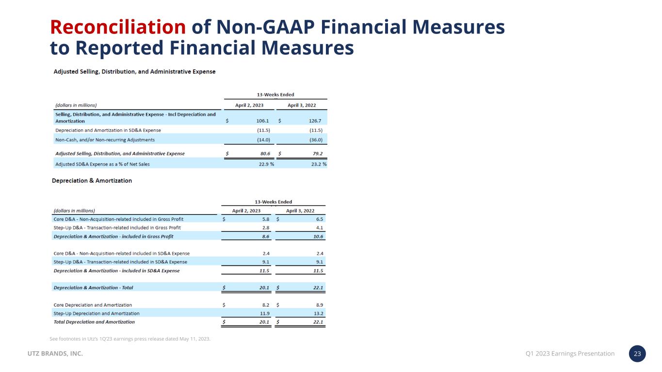 UTZ BRANDS, INC. 22 Reconciliation of Non-GAAP Financial Measures to Reported Financial Measures Q1 2023 Earnings Presentation See footnotes in Utz’s 1Q’23 earnings press release dated May 11, 2023.