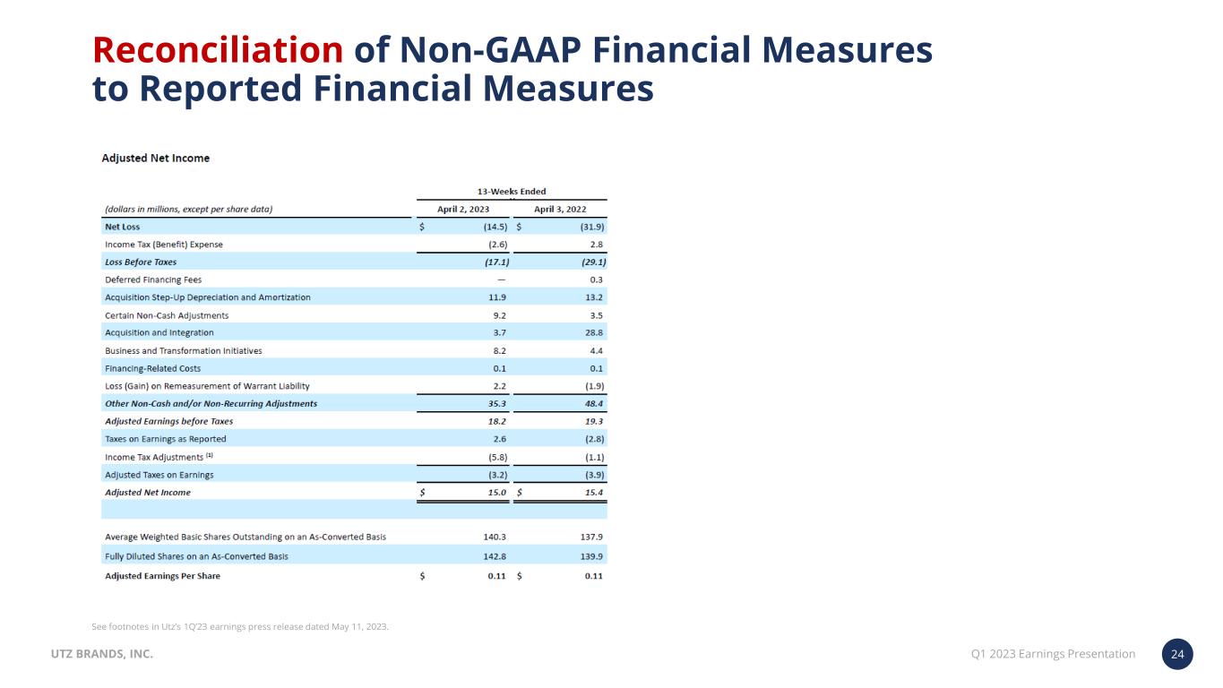 UTZ BRANDS, INC. Q1 2023 Earnings Presentation 23 Reconciliation of Non-GAAP Financial Measures to Reported Financial Measures See footnotes in Utz’s 1Q’23 earnings press release dated May 11, 2023.