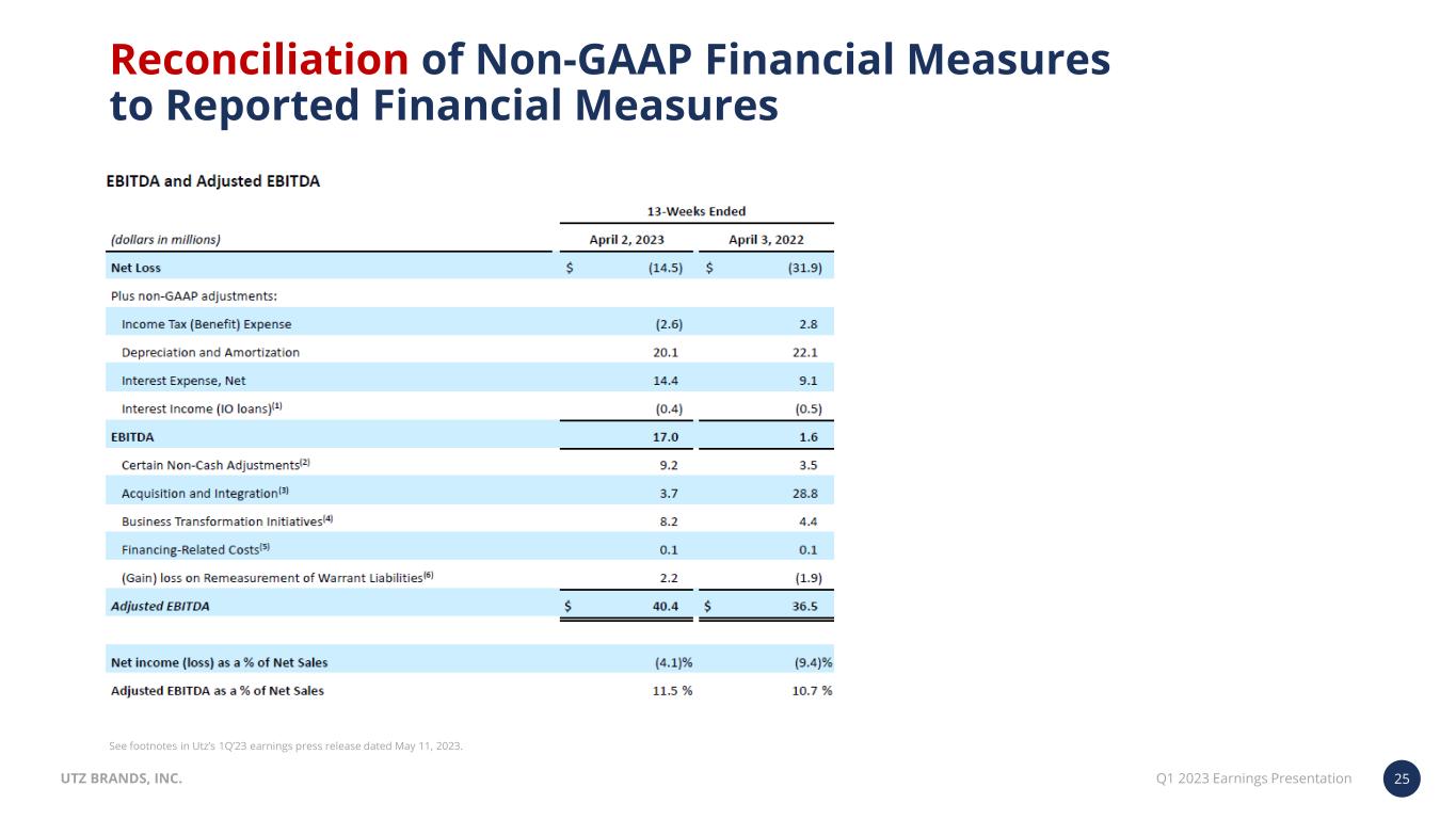UTZ BRANDS, INC. 24 Reconciliation of Non-GAAP Financial Measures to Reported Financial Measures Q1 2023 Earnings Presentation See footnotes in Utz’s 1Q’23 earnings press release dated May 11, 2023.