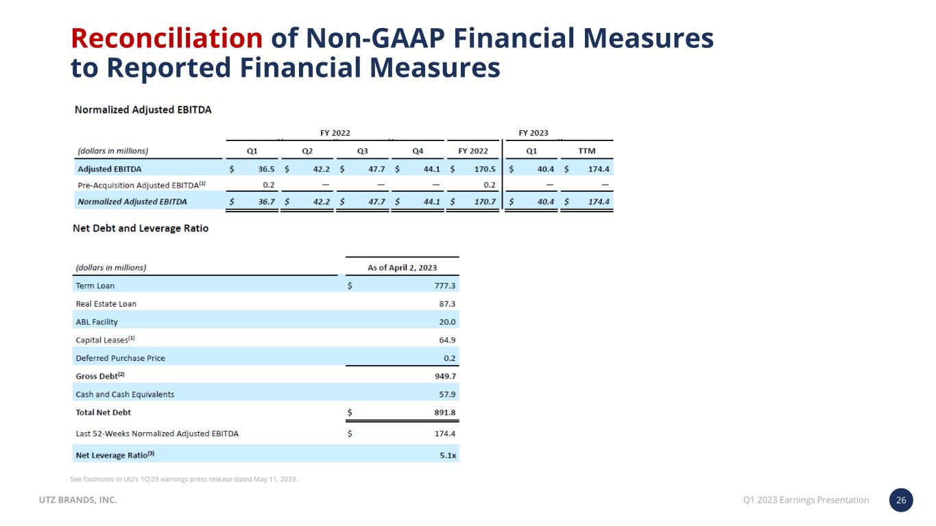 25UTZ BRANDS, INC. Reconciliation of Non-GAAP Financial Measures to Reported Financial Measures Q1 2023 Earnings Presentation See footnotes in Utz’s 1Q’23 earnings press release dated May 11, 2023.