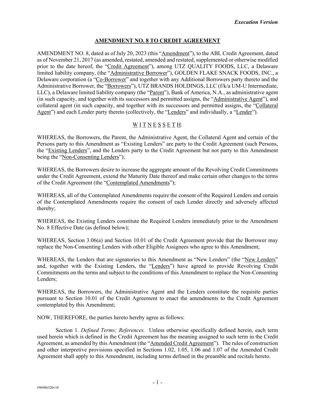 Execution Version - 1 - #96986320v10 AMENDMENT NO. 8 TO CREDIT AGREEMENT AMENDMENT NO. 8, dated as of July 20, 2023 (this “Amendment”), to the ABL Credit Agreement, dated as of November 21, 2017 (as amended, restated, amended and restated, supplemented or otherwise modified prior to the date hereof, the “Credit Agreement”), among UTZ QUALITY FOODS, LLC, a Delaware limited liability company, (the “Administrative Borrower”), GOLDEN FLAKE SNACK FOODS, INC., a Delaware corporation (a “Co-Borrower” and together with any Additional Borrowers party thereto and the Administrative Borrower, the “Borrowers”), UTZ BRANDS HOLDINGS, LLC (f/k/a UM-U Intermediate, LLC), a Delaware limited liability company (the “Parent”), Bank of America, N.A., as administrative agent (in such capacity, and together with its successors and permitted assigns, the “Administrative Agent”), and collateral agent (in such capacity, and together with its successors and permitted assigns, the “Collateral Agent”) and each Lender party thereto (collectively, the “Lenders” and individually, a “Lender”). W I T N E S S E T H: WHEREAS, the Borrowers, the Parent, the Administrative Agent, the Collateral Agent and certain of the Persons party to this Amendment as “Existing Lenders” are party to the Credit Agreement (such Persons, the “Existing Lenders”, and the Lenders party to the Credit Agreement but not party to this Amendment being the “Non-Consenting Lenders”); WHEREAS, the Borrowers desire to increase the aggregate amount of the Revolving Credit Commitments under the Credit Agreement, extend the Maturity Date thereof and make certain other changes to the terms of the Credit Agreement (the “Contemplated Amendments”); WHEREAS, all of the Contemplated Amendments require the consent of the Required Lenders and certain of the Contemplated Amendments require the consent of each Lender directly and adversely affected thereby; WHEREAS, the Existing Lenders constitute the Required Lenders immediately prior to the Amendment No. 8 Effective Date (as defined below); WHEREAS, Section 3.06(a) and Section 10.01 of the Credit Agreement provide that the Borrower may replace the Non-Consenting Lenders with other Eligible Assignees who agree to this Amendment; WHEREAS, the Lenders that are signatories to this Amendment as “New Lenders” (the “New Lenders” and, together with the Existing Lenders, the “Lenders”) have agreed to provide Revolving Credit Commitments on the terms and subject to the conditions of this Amendment to replace the Non-Consenting Lenders; WHEREAS, the Borrowers, the Administrative Agent and the Lenders constitute the requisite parties pursuant to Section 10.01 of the Credit Agreement to enact the amendments to the Credit Agreement contemplated by this Amendment; NOW, THEREFORE, the parties hereto hereby agree as follows: Section 1. Defined Terms; References. Unless otherwise specifically defined herein, each term used herein which is defined in the Credit Agreement has the meaning assigned to such term in the Credit Agreement, as amended by this Amendment (the “Amended Credit Agreement”). The rules of construction and other interpretive provisions specified in Sections 1.02, 1.05, 1.06 and 1.07 of the Amended Credit Agreement shall apply to this Amendment, including terms defined in the preamble and recitals hereto.