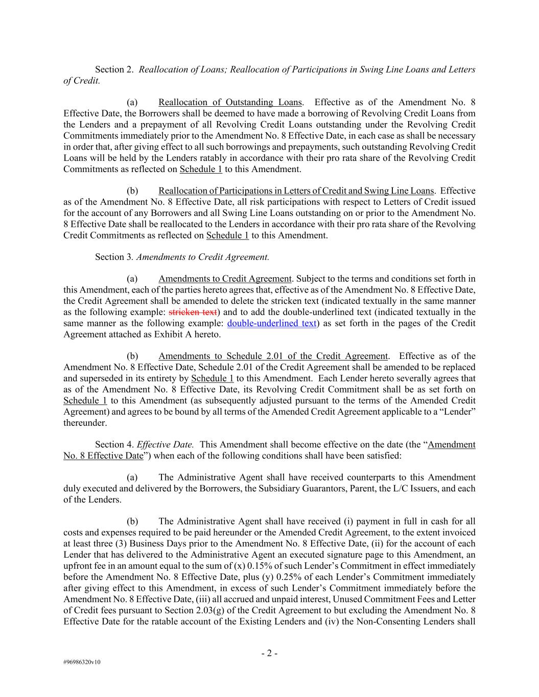 - 2 - #96986320v10 Section 2. Reallocation of Loans; Reallocation of Participations in Swing Line Loans and Letters of Credit. (a) Reallocation of Outstanding Loans. Effective as of the Amendment No. 8 Effective Date, the Borrowers shall be deemed to have made a borrowing of Revolving Credit Loans from the Lenders and a prepayment of all Revolving Credit Loans outstanding under the Revolving Credit Commitments immediately prior to the Amendment No. 8 Effective Date, in each case as shall be necessary in order that, after giving effect to all such borrowings and prepayments, such outstanding Revolving Credit Loans will be held by the Lenders ratably in accordance with their pro rata share of the Revolving Credit Commitments as reflected on Schedule 1 to this Amendment. (b) Reallocation of Participations in Letters of Credit and Swing Line Loans. Effective as of the Amendment No. 8 Effective Date, all risk participations with respect to Letters of Credit issued for the account of any Borrowers and all Swing Line Loans outstanding on or prior to the Amendment No. 8 Effective Date shall be reallocated to the Lenders in accordance with their pro rata share of the Revolving Credit Commitments as reflected on Schedule 1 to this Amendment. Section 3. Amendments to Credit Agreement. (a) Amendments to Credit Agreement. Subject to the terms and conditions set forth in this Amendment, each of the parties hereto agrees that, effective as of the Amendment No. 8 Effective Date, the Credit Agreement shall be amended to delete the stricken text (indicated textually in the same manner as the following example: stricken text) and to add the double-underlined text (indicated textually in the same manner as the following example: double-underlined text) as set forth in the pages of the Credit Agreement attached as Exhibit A hereto. (b) Amendments to Schedule 2.01 of the Credit Agreement. Effective as of the Amendment No. 8 Effective Date, Schedule 2.01 of the Credit Agreement shall be amended to be replaced and superseded in its entirety by Schedule 1 to this Amendment. Each Lender hereto severally agrees that as of the Amendment No. 8 Effective Date, its Revolving Credit Commitment shall be as set forth on Schedule 1 to this Amendment (as subsequently adjusted pursuant to the terms of the Amended Credit Agreement) and agrees to be bound by all terms of the Amended Credit Agreement applicable to a “Lender” thereunder. Section 4. Effective Date. This Amendment shall become effective on the date (the “Amendment No. 8 Effective Date”) when each of the following conditions shall have been satisfied: (a) The Administrative Agent shall have received counterparts to this Amendment duly executed and delivered by the Borrowers, the Subsidiary Guarantors, Parent, the L/C Issuers, and each of the Lenders. (b) The Administrative Agent shall have received (i) payment in full in cash for all costs and expenses required to be paid hereunder or the Amended Credit Agreement, to the extent invoiced at least three (3) Business Days prior to the Amendment No. 8 Effective Date, (ii) for the account of each Lender that has delivered to the Administrative Agent an executed signature page to this Amendment, an upfront fee in an amount equal to the sum of (x) 0.15% of such Lender’s Commitment in effect immediately before the Amendment No. 8 Effective Date, plus (y) 0.25% of each Lender’s Commitment immediately after giving effect to this Amendment, in excess of such Lender’s Commitment immediately before the Amendment No. 8 Effective Date, (iii) all accrued and unpaid interest, Unused Commitment Fees and Letter of Credit fees pursuant to Section 2.03(g) of the Credit Agreement to but excluding the Amendment No. 8 Effective Date for the ratable account of the Existing Lenders and (iv) the Non-Consenting Lenders shall