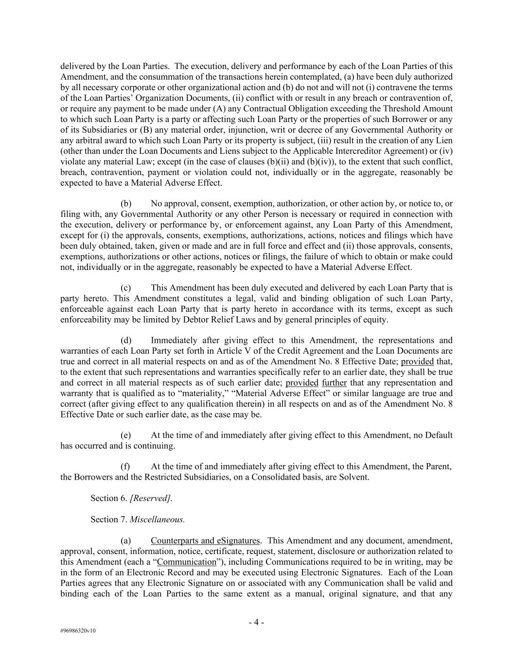 - 4 - #96986320v10 delivered by the Loan Parties. The execution, delivery and performance by each of the Loan Parties of this Amendment, and the consummation of the transactions herein contemplated, (a) have been duly authorized by all necessary corporate or other organizational action and (b) do not and will not (i) contravene the terms of the Loan Parties’ Organization Documents, (ii) conflict with or result in any breach or contravention of, or require any payment to be made under (A) any Contractual Obligation exceeding the Threshold Amount to which such Loan Party is a party or affecting such Loan Party or the properties of such Borrower or any of its Subsidiaries or (B) any material order, injunction, writ or decree of any Governmental Authority or any arbitral award to which such Loan Party or its property is subject, (iii) result in the creation of any Lien (other than under the Loan Documents and Liens subject to the Applicable Intercreditor Agreement) or (iv) violate any material Law; except (in the case of clauses (b)(ii) and (b)(iv)), to the extent that such conflict, breach, contravention, payment or violation could not, individually or in the aggregate, reasonably be expected to have a Material Adverse Effect. (b) No approval, consent, exemption, authorization, or other action by, or notice to, or filing with, any Governmental Authority or any other Person is necessary or required in connection with the execution, delivery or performance by, or enforcement against, any Loan Party of this Amendment, except for (i) the approvals, consents, exemptions, authorizations, actions, notices and filings which have been duly obtained, taken, given or made and are in full force and effect and (ii) those approvals, consents, exemptions, authorizations or other actions, notices or filings, the failure of which to obtain or make could not, individually or in the aggregate, reasonably be expected to have a Material Adverse Effect. (c) This Amendment has been duly executed and delivered by each Loan Party that is party hereto. This Amendment constitutes a legal, valid and binding obligation of such Loan Party, enforceable against each Loan Party that is party hereto in accordance with its terms, except as such enforceability may be limited by Debtor Relief Laws and by general principles of equity. (d) Immediately after giving effect to this Amendment, the representations and warranties of each Loan Party set forth in Article V of the Credit Agreement and the Loan Documents are true and correct in all material respects on and as of the Amendment No. 8 Effective Date; provided that, to the extent that such representations and warranties specifically refer to an earlier date, they shall be true and correct in all material respects as of such earlier date; provided further that any representation and warranty that is qualified as to “materiality,” “Material Adverse Effect” or similar language are true and correct (after giving effect to any qualification therein) in all respects on and as of the Amendment No. 8 Effective Date or such earlier date, as the case may be. (e) At the time of and immediately after giving effect to this Amendment, no Default has occurred and is continuing. (f) At the time of and immediately after giving effect to this Amendment, the Parent, the Borrowers and the Restricted Subsidiaries, on a Consolidated basis, are Solvent. Section 6. [Reserved]. Section 7. Miscellaneous. (a) Counterparts and eSignatures. This Amendment and any document, amendment, approval, consent, information, notice, certificate, request, statement, disclosure or authorization related to this Amendment (each a “Communication”), including Communications required to be in writing, may be in the form of an Electronic Record and may be executed using Electronic Signatures. Each of the Loan Parties agrees that any Electronic Signature on or associated with any Communication shall be valid and binding each of the Loan Parties to the same extent as a manual, original signature, and that any