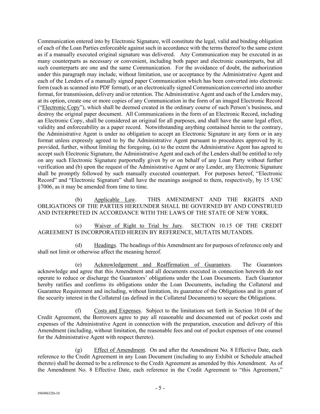 - 5 - #96986320v10 Communication entered into by Electronic Signature, will constitute the legal, valid and binding obligation of each of the Loan Parties enforceable against such in accordance with the terms thereof to the same extent as if a manually executed original signature was delivered. Any Communication may be executed in as many counterparts as necessary or convenient, including both paper and electronic counterparts, but all such counterparts are one and the same Communication. For the avoidance of doubt, the authorization under this paragraph may include, without limitation, use or acceptance by the Administrative Agent and each of the Lenders of a manually signed paper Communication which has been converted into electronic form (such as scanned into PDF format), or an electronically signed Communication converted into another format, for transmission, delivery and/or retention. The Administrative Agent and each of the Lenders may, at its option, create one or more copies of any Communication in the form of an imaged Electronic Record (“Electronic Copy”), which shall be deemed created in the ordinary course of such Person’s business, and destroy the original paper document. All Communications in the form of an Electronic Record, including an Electronic Copy, shall be considered an original for all purposes, and shall have the same legal effect, validity and enforceability as a paper record. Notwithstanding anything contained herein to the contrary, the Administrative Agent is under no obligation to accept an Electronic Signature in any form or in any format unless expressly agreed to by the Administrative Agent pursuant to procedures approved by it; provided, further, without limiting the foregoing, (a) to the extent the Administrative Agent has agreed to accept such Electronic Signature, the Administrative Agent and each of the Lenders shall be entitled to rely on any such Electronic Signature purportedly given by or on behalf of any Loan Party without further verification and (b) upon the request of the Administrative Agent or any Lender, any Electronic Signature shall be promptly followed by such manually executed counterpart. For purposes hereof, “Electronic Record” and “Electronic Signature” shall have the meanings assigned to them, respectively, by 15 USC §7006, as it may be amended from time to time. (b) Applicable Law. THIS AMENDMENT AND THE RIGHTS AND OBLIGATIONS OF THE PARTIES HEREUNDER SHALL BE GOVERNED BY AND CONSTRUED AND INTERPRETED IN ACCORDANCE WITH THE LAWS OF THE STATE OF NEW YORK. (c) Waiver of Right to Trial by Jury. SECTION 10.15 OF THE CREDIT AGREEMENT IS INCORPORATED HEREIN BY REFERENCE, MUTATIS MUTANDIS. (d) Headings. The headings of this Amendment are for purposes of reference only and shall not limit or otherwise affect the meaning hereof. (e) Acknowledgement and Reaffirmation of Guarantors. The Guarantors acknowledge and agree that this Amendment and all documents executed in connection herewith do not operate to reduce or discharge the Guarantors’ obligations under the Loan Documents. Each Guarantor hereby ratifies and confirms its obligations under the Loan Documents, including the Collateral and Guarantee Requirement and including, without limitation, its guarantee of the Obligations and its grant of the security interest in the Collateral (as defined in the Collateral Documents) to secure the Obligations. (f) Costs and Expenses. Subject to the limitations set forth in Section 10.04 of the Credit Agreement, the Borrowers agree to pay all reasonable and documented out of pocket costs and expenses of the Administrative Agent in connection with the preparation, execution and delivery of this Amendment (including, without limitation, the reasonable fees and out of pocket expenses of one counsel for the Administrative Agent with respect thereto). (g) Effect of Amendment. On and after the Amendment No. 8 Effective Date, each reference to the Credit Agreement in any Loan Document (including to any Exhibit or Schedule attached thereto) shall be deemed to be a reference to the Credit Agreement as amended by this Amendment. As of the Amendment No. 8 Effective Date, each reference in the Credit Agreement to “this Agreement,”