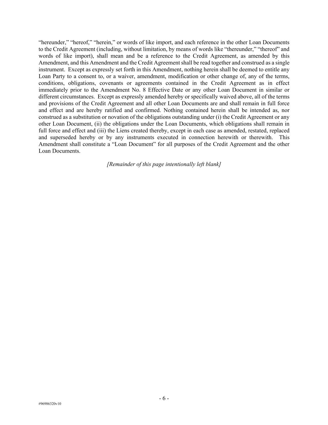 - 6 - #96986320v10 “hereunder,” “hereof,” “herein,” or words of like import, and each reference in the other Loan Documents to the Credit Agreement (including, without limitation, by means of words like “thereunder,” “thereof” and words of like import), shall mean and be a reference to the Credit Agreement, as amended by this Amendment, and this Amendment and the Credit Agreement shall be read together and construed as a single instrument. Except as expressly set forth in this Amendment, nothing herein shall be deemed to entitle any Loan Party to a consent to, or a waiver, amendment, modification or other change of, any of the terms, conditions, obligations, covenants or agreements contained in the Credit Agreement as in effect immediately prior to the Amendment No. 8 Effective Date or any other Loan Document in similar or different circumstances. Except as expressly amended hereby or specifically waived above, all of the terms and provisions of the Credit Agreement and all other Loan Documents are and shall remain in full force and effect and are hereby ratified and confirmed. Nothing contained herein shall be intended as, nor construed as a substitution or novation of the obligations outstanding under (i) the Credit Agreement or any other Loan Document, (ii) the obligations under the Loan Documents, which obligations shall remain in full force and effect and (iii) the Liens created thereby, except in each case as amended, restated, replaced and superseded hereby or by any instruments executed in connection herewith or therewith. This Amendment shall constitute a “Loan Document” for all purposes of the Credit Agreement and the other Loan Documents. [Remainder of this page intentionally left blank]