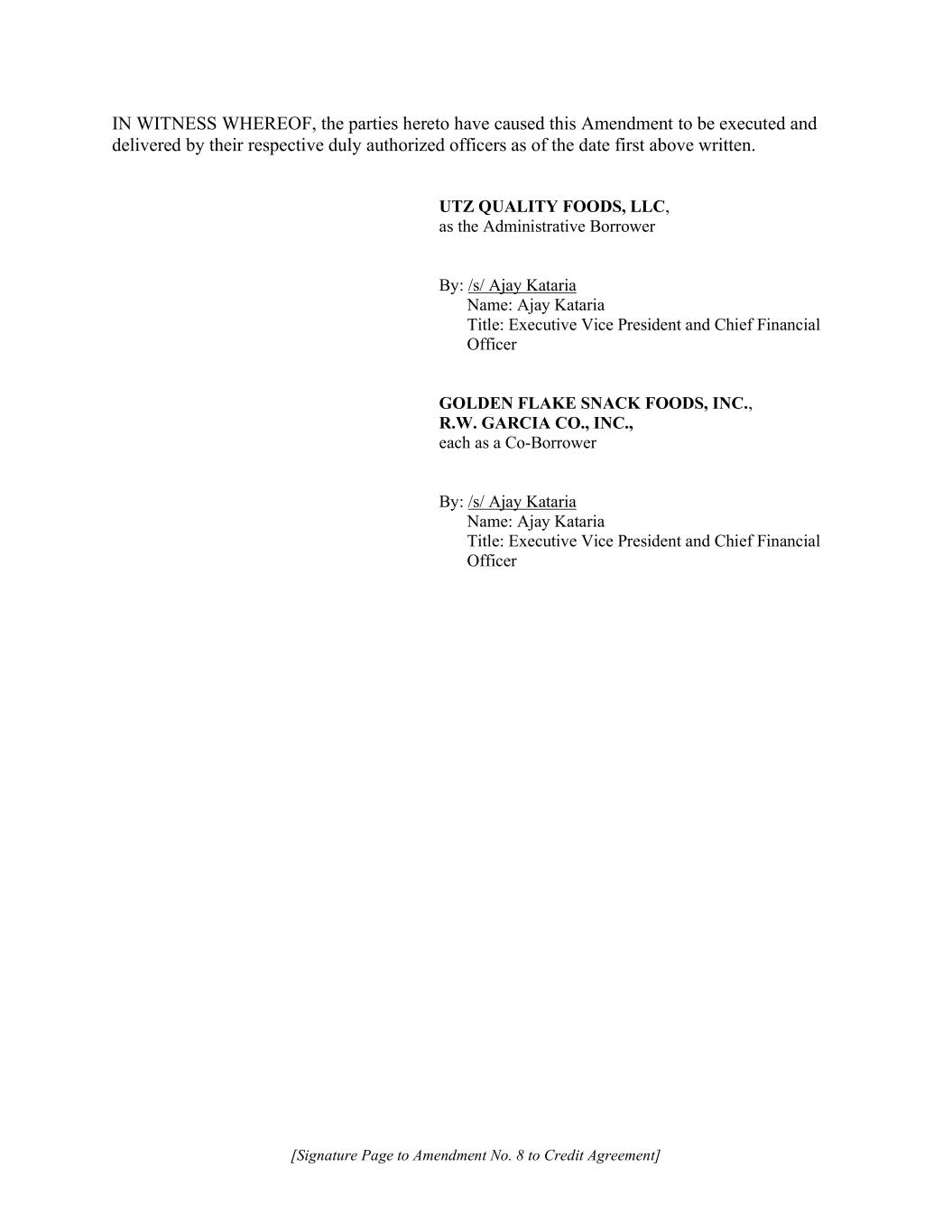 [Signature Page to Amendment No. 8 to Credit Agreement] IN WITNESS WHEREOF, the parties hereto have caused this Amendment to be executed and delivered by their respective duly authorized officers as of the date first above written. UTZ QUALITY FOODS, LLC, as the Administrative Borrower By: /s/ Ajay Kataria Name: Ajay Kataria Title: Executive Vice President and Chief Financial Officer GOLDEN FLAKE SNACK FOODS, INC., R.W. GARCIA CO., INC., each as a Co-Borrower By: /s/ Ajay Kataria Name: Ajay Kataria Title: Executive Vice President and Chief Financial Officer