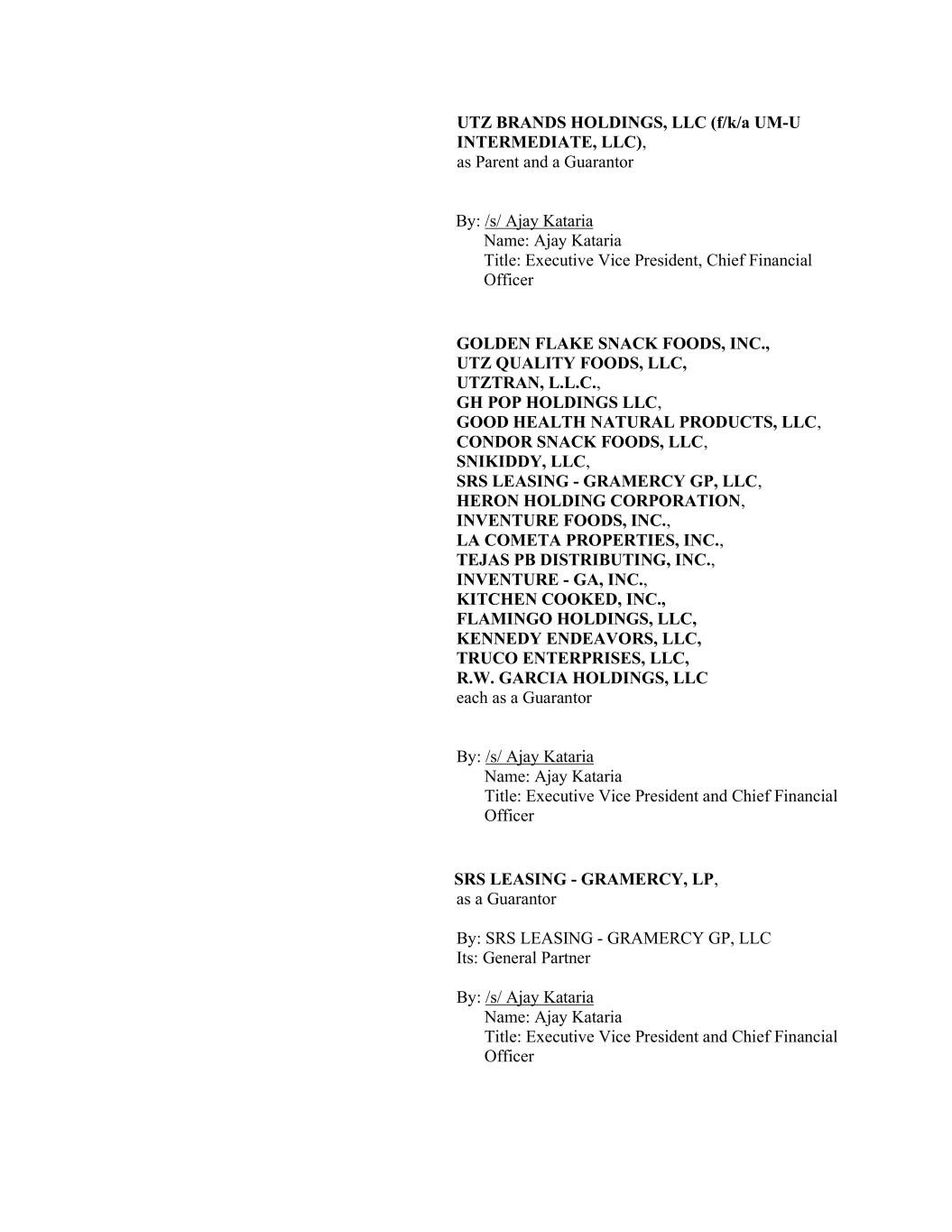 UTZ BRANDS HOLDINGS, LLC (f/k/a UM-U INTERMEDIATE, LLC), as Parent and a Guarantor By: /s/ Ajay Kataria Name: Ajay Kataria Title: Executive Vice President, Chief Financial Officer GOLDEN FLAKE SNACK FOODS, INC., UTZ QUALITY FOODS, LLC, UTZTRAN, L.L.C., GH POP HOLDINGS LLC, GOOD HEALTH NATURAL PRODUCTS, LLC, CONDOR SNACK FOODS, LLC, SNIKIDDY, LLC, SRS LEASING - GRAMERCY GP, LLC, HERON HOLDING CORPORATION, INVENTURE FOODS, INC., LA COMETA PROPERTIES, INC., TEJAS PB DISTRIBUTING, INC., INVENTURE - GA, INC., KITCHEN COOKED, INC., FLAMINGO HOLDINGS, LLC, KENNEDY ENDEAVORS, LLC, TRUCO ENTERPRISES, LLC, R.W. GARCIA HOLDINGS, LLC each as a Guarantor By: /s/ Ajay Kataria Name: Ajay Kataria Title: Executive Vice President and Chief Financial Officer SRS LEASING - GRAMERCY, LP, as a Guarantor By: SRS LEASING - GRAMERCY GP, LLC Its: General Partner By: /s/ Ajay Kataria Name: Ajay Kataria Title: Executive Vice President and Chief Financial Officer