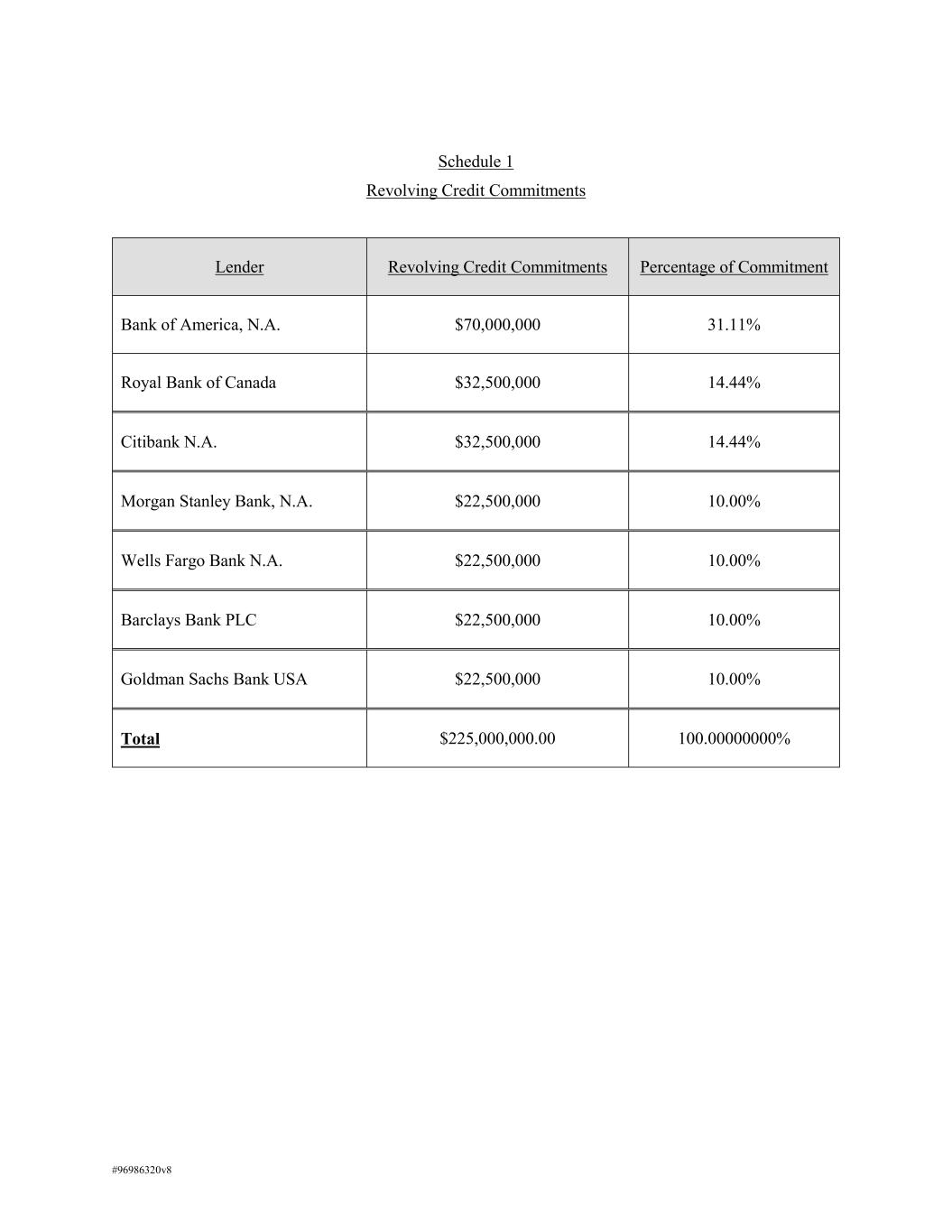 #96986320v8 Schedule 1 Revolving Credit Commitments Lender Revolving Credit Commitments Percentage of Commitment Bank of America, N.A. $70,000,000 31.11% Royal Bank of Canada $32,500,000 14.44% Citibank N.A. $32,500,000 14.44% Morgan Stanley Bank, N.A. $22,500,000 10.00% Wells Fargo Bank N.A. $22,500,000 10.00% Barclays Bank PLC $22,500,000 10.00% Goldman Sachs Bank USA $22,500,000 10.00% Total $225,000,000.00 100.00000000%