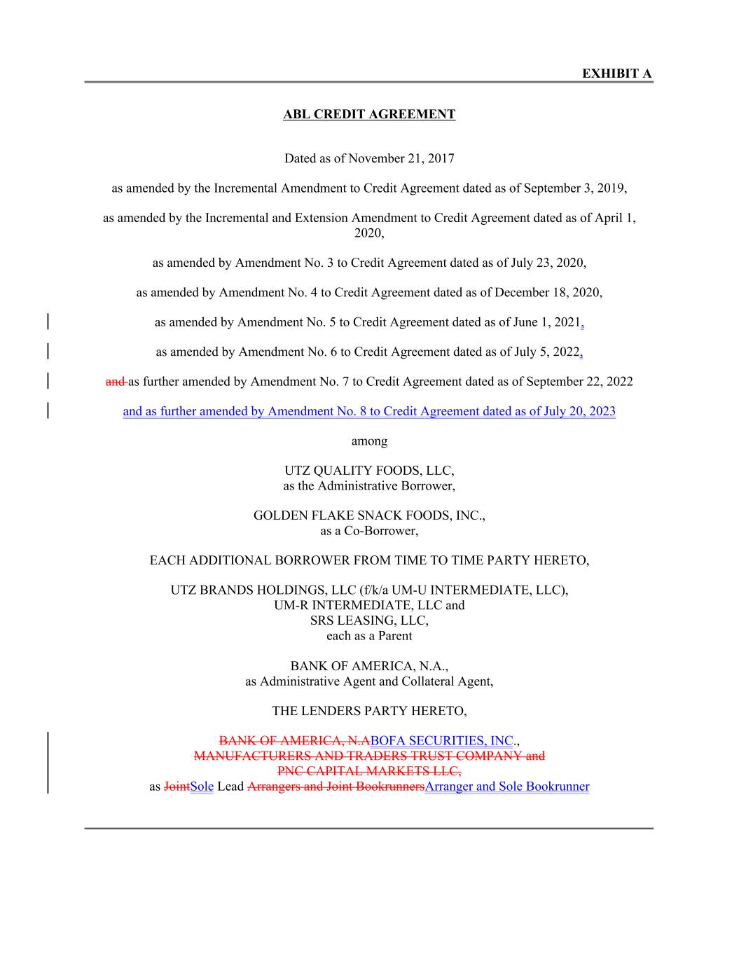 EXHIBIT A ABL CREDIT AGREEMENT Dated as of November 21, 2017 as amended by the Incremental Amendment to Credit Agreement dated as of September 3, 2019, as amended by the Incremental and Extension Amendment to Credit Agreement dated as of April 1, 2020, as amended by Amendment No. 3 to Credit Agreement dated as of July 23, 2020, as amended by Amendment No. 4 to Credit Agreement dated as of December 18, 2020, as amended by Amendment No. 5 to Credit Agreement dated as of June 1, 2021, as amended by Amendment No. 6 to Credit Agreement dated as of July 5, 2022, and as further amended by Amendment No. 7 to Credit Agreement dated as of September 22, 2022 and as further amended by Amendment No. 8 to Credit Agreement dated as of July 20, 2023 among UTZ QUALITY FOODS, LLC, as the Administrative Borrower, GOLDEN FLAKE SNACK FOODS, INC., as a Co-Borrower, EACH ADDITIONAL BORROWER FROM TIME TO TIME PARTY HERETO, UTZ BRANDS HOLDINGS, LLC (f/k/a UM-U INTERMEDIATE, LLC), UM-R INTERMEDIATE, LLC and SRS LEASING, LLC, each as a Parent BANK OF AMERICA, N.A., as Administrative Agent and Collateral Agent, THE LENDERS PARTY HERETO, BANK OF AMERICA, N.ABOFA SECURITIES, INC., MANUFACTURERS AND TRADERS TRUST COMPANY and PNC CAPITAL MARKETS LLC, as JointSole Lead Arrangers and Joint BookrunnersArranger and Sole Bookrunner