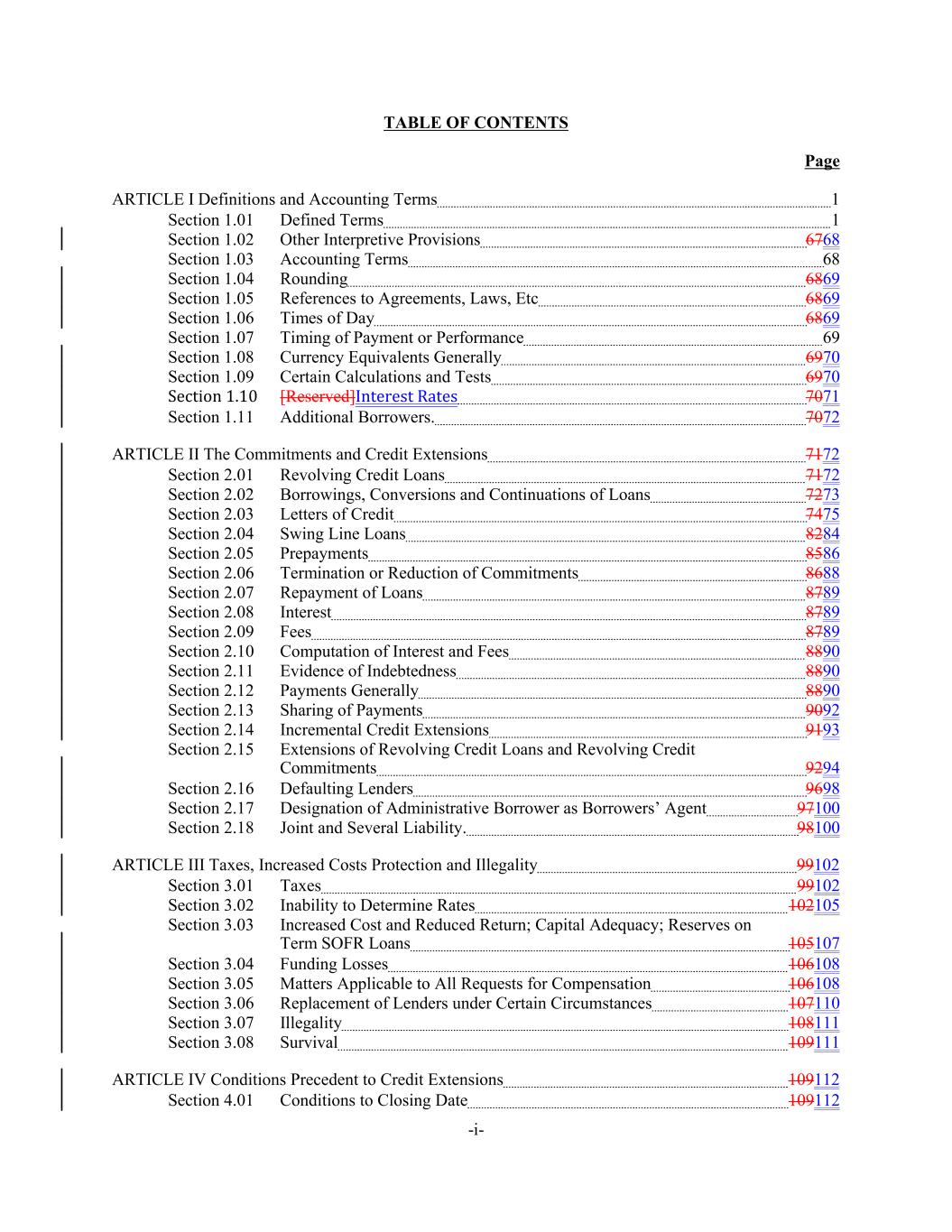 TABLE OF CONTENTS Page ARTICLE I Definitions and Accounting Terms 1 Section 1.01 Defined Terms 1 Section 1.02 Other Interpretive Provisions 6768 Section 1.03 Accounting Terms 68 Section 1.04 Rounding 6869 Section 1.05 References to Agreements, Laws, Etc 6869 Section 1.06 Times of Day 6869 Section 1.07 Timing of Payment or Performance 69 Section 1.08 Currency Equivalents Generally 6970 Section 1.09 Certain Calculations and Tests 6970 Section 1.10 [Reserved]Interest Rates 7071 Section 1.11 Additional Borrowers. 7072 ARTICLE II The Commitments and Credit Extensions 7172 Section 2.01 Revolving Credit Loans 7172 Section 2.02 Borrowings, Conversions and Continuations of Loans 7273 Section 2.03 Letters of Credit 7475 Section 2.04 Swing Line Loans 8284 Section 2.05 Prepayments 8586 Section 2.06 Termination or Reduction of Commitments 8688 Section 2.07 Repayment of Loans 8789 Section 2.08 Interest 8789 Section 2.09 Fees 8789 Section 2.10 Computation of Interest and Fees 8890 Section 2.11 Evidence of Indebtedness 8890 Section 2.12 Payments Generally 8890 Section 2.13 Sharing of Payments 9092 Section 2.14 Incremental Credit Extensions 9193 Section 2.15 Extensions of Revolving Credit Loans and Revolving Credit Commitments 9294 Section 2.16 Defaulting Lenders 9698 Section 2.17 Designation of Administrative Borrower as Borrowers’ Agent 97100 Section 2.18 Joint and Several Liability. 98100 ARTICLE III Taxes, Increased Costs Protection and Illegality 99102 Section 3.01 Taxes 99102 Section 3.02 Inability to Determine Rates 102105 Section 3.03 Increased Cost and Reduced Return; Capital Adequacy; Reserves on Term SOFR Loans 105107 Section 3.04 Funding Losses 106108 Section 3.05 Matters Applicable to All Requests for Compensation 106108 Section 3.06 Replacement of Lenders under Certain Circumstances 107110 Section 3.07 Illegality 108111 Section 3.08 Survival 109111 ARTICLE IV Conditions Precedent to Credit Extensions 109112 Section 4.01 Conditions to Closing Date 109112 -i-