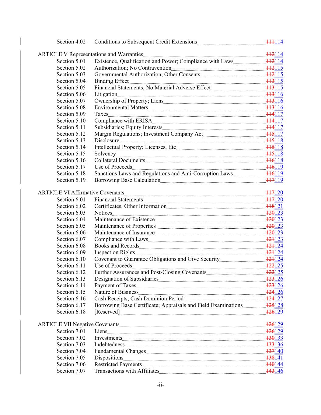 Section 4.02 Conditions to Subsequent Credit Extensions 111114 ARTICLE V Representations and Warranties 112114 Section 5.01 Existence, Qualification and Power; Compliance with Laws 112114 Section 5.02 Authorization; No Contravention 112115 Section 5.03 Governmental Authorization; Other Consents 112115 Section 5.04 Binding Effect 113115 Section 5.05 Financial Statements; No Material Adverse Effect 113115 Section 5.06 Litigation 113116 Section 5.07 Ownership of Property; Liens 113116 Section 5.08 Environmental Matters 113116 Section 5.09 Taxes 114117 Section 5.10 Compliance with ERISA 114117 Section 5.11 Subsidiaries; Equity Interests 114117 Section 5.12 Margin Regulations; Investment Company Act 115117 Section 5.13 Disclosure 115118 Section 5.14 Intellectual Property; Licenses, Etc 115118 Section 5.15 Solvency 115118 Section 5.16 Collateral Documents 116118 Section 5.17 Use of Proceeds 116119 Section 5.18 Sanctions Laws and Regulations and Anti-Corruption Laws 116119 Section 5.19 Borrowing Base Calculation 117119 ARTICLE VI Affirmative Covenants 117120 Section 6.01 Financial Statements 117120 Section 6.02 Certificates; Other Information 118121 Section 6.03 Notices 120123 Section 6.04 Maintenance of Existence 120123 Section 6.05 Maintenance of Properties 120123 Section 6.06 Maintenance of Insurance 120123 Section 6.07 Compliance with Laws 121123 Section 6.08 Books and Records 121124 Section 6.09 Inspection Rights 121124 Section 6.10 Covenant to Guarantee Obligations and Give Security 121124 Section 6.11 Use of Proceeds 122125 Section 6.12 Further Assurances and Post-Closing Covenants 122125 Section 6.13 Designation of Subsidiaries 123126 Section 6.14 Payment of Taxes 123126 Section 6.15 Nature of Business 124126 Section 6.16 Cash Receipts; Cash Dominion Period 124127 Section 6.17 Borrowing Base Certificate; Appraisals and Field Examinations 125128 Section 6.18 [Reserved] 126129 ARTICLE VII Negative Covenants 126129 Section 7.01 Liens 126129 Section 7.02 Investments 130133 Section 7.03 Indebtedness 133136 Section 7.04 Fundamental Changes 137140 Section 7.05 Dispositions 138141 Section 7.06 Restricted Payments 140144 Section 7.07 Transactions with Affiliates 143146 -ii-